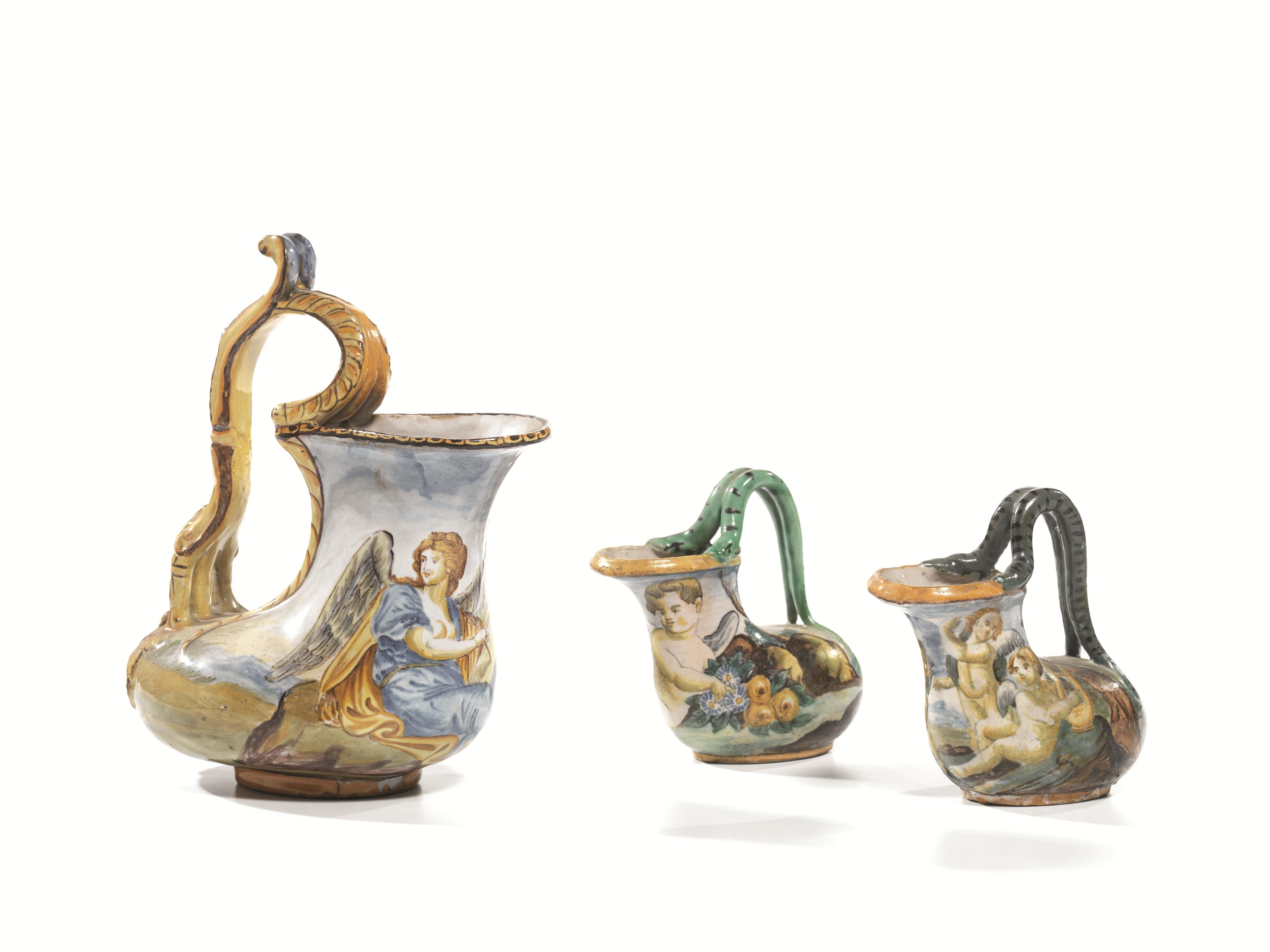 Coppia di piccoli versatoi, sec. XVIII, in maiolica, decorata con putti, anse serpentiformi, alt. cm 13 ed altro versatoio, sec. XVIII, in maiolica, decorata con Allegoria della Pittura, alt. cm 23 (3)
