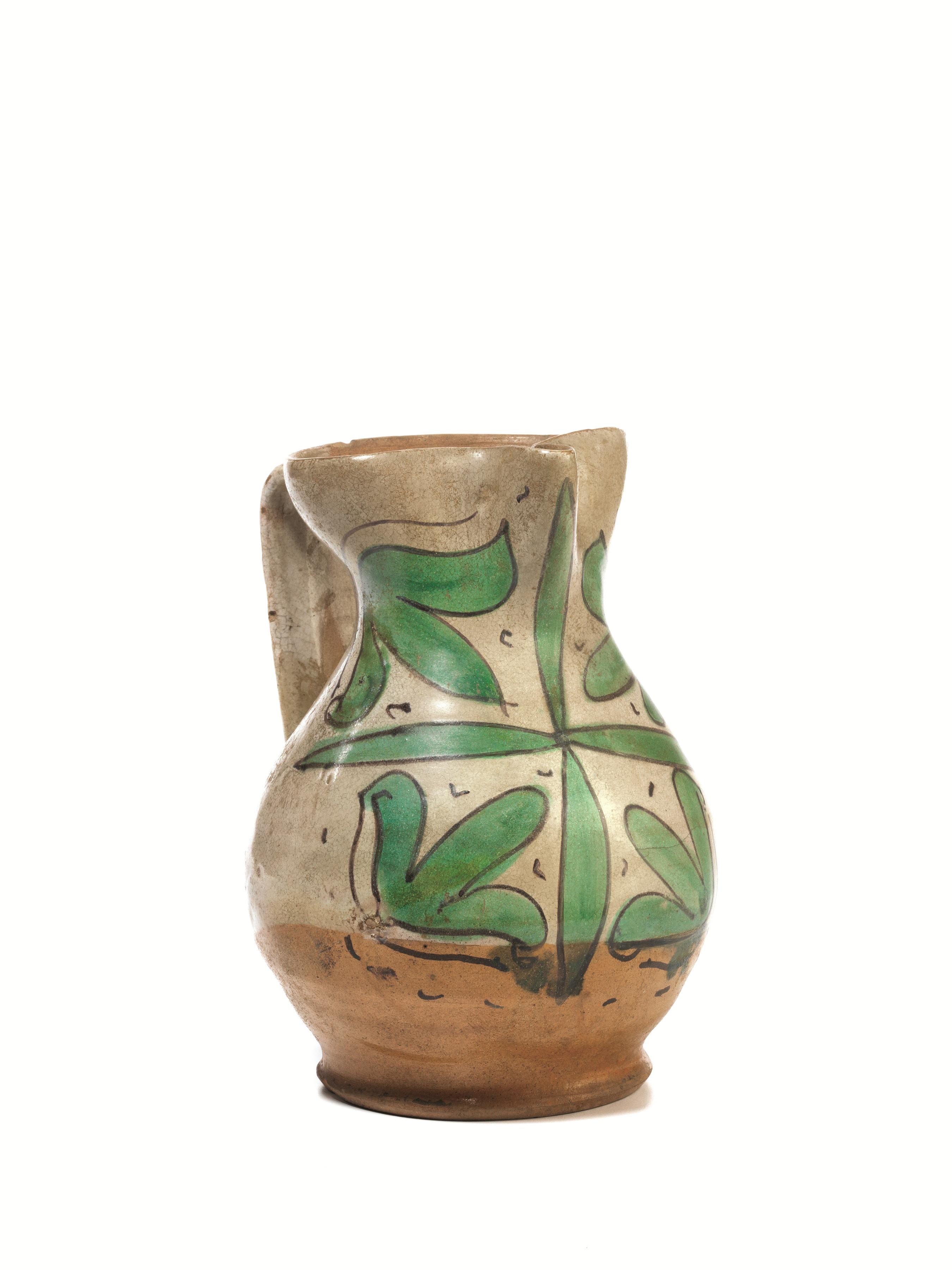 Boccale, probabilmente Viterbo, sec. XVI, in maiolica decorata a grandi fiori in verde rame profilati in bruno manganese, ansa a nastro, alt. cm 20, filé