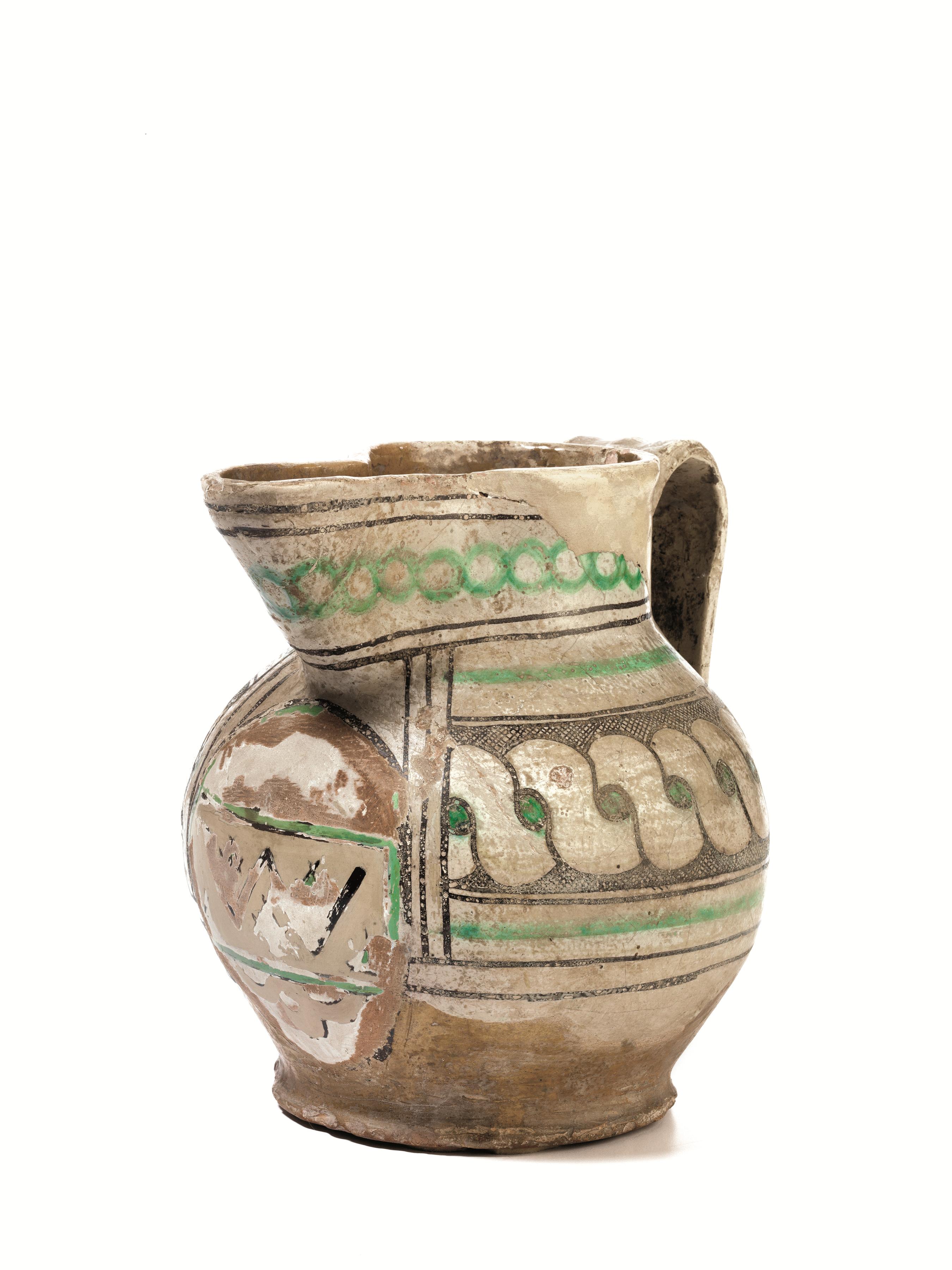Boccale, Deruta o Todi, sec. XIV, in maiolica, decorata in verde ramina e bruno a motivi geometrici, corpo globulare, grande becco a civetta, ansa a nastro, alt. cm 23, danni e restauri