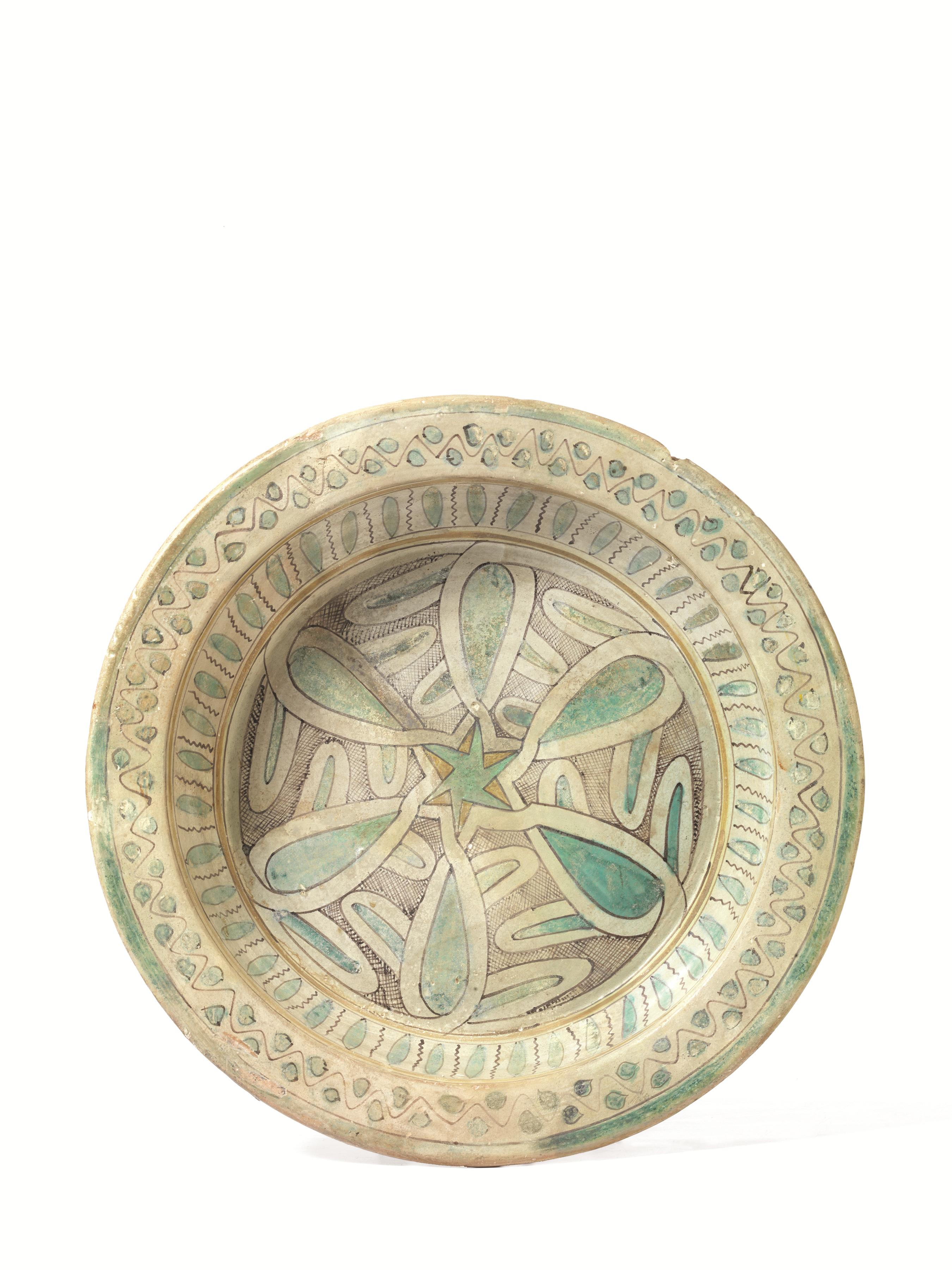 Grande vassoio fondo, zona Fiorentina-Montelupo, metà sec. XV, in maiolica interamente decorata in verde ramina e bruno manganese a motivo a reticolo e foglie stilizzate, tesa a elementi circolari entro una linea spezzata, diam. cm 40,5, restauri