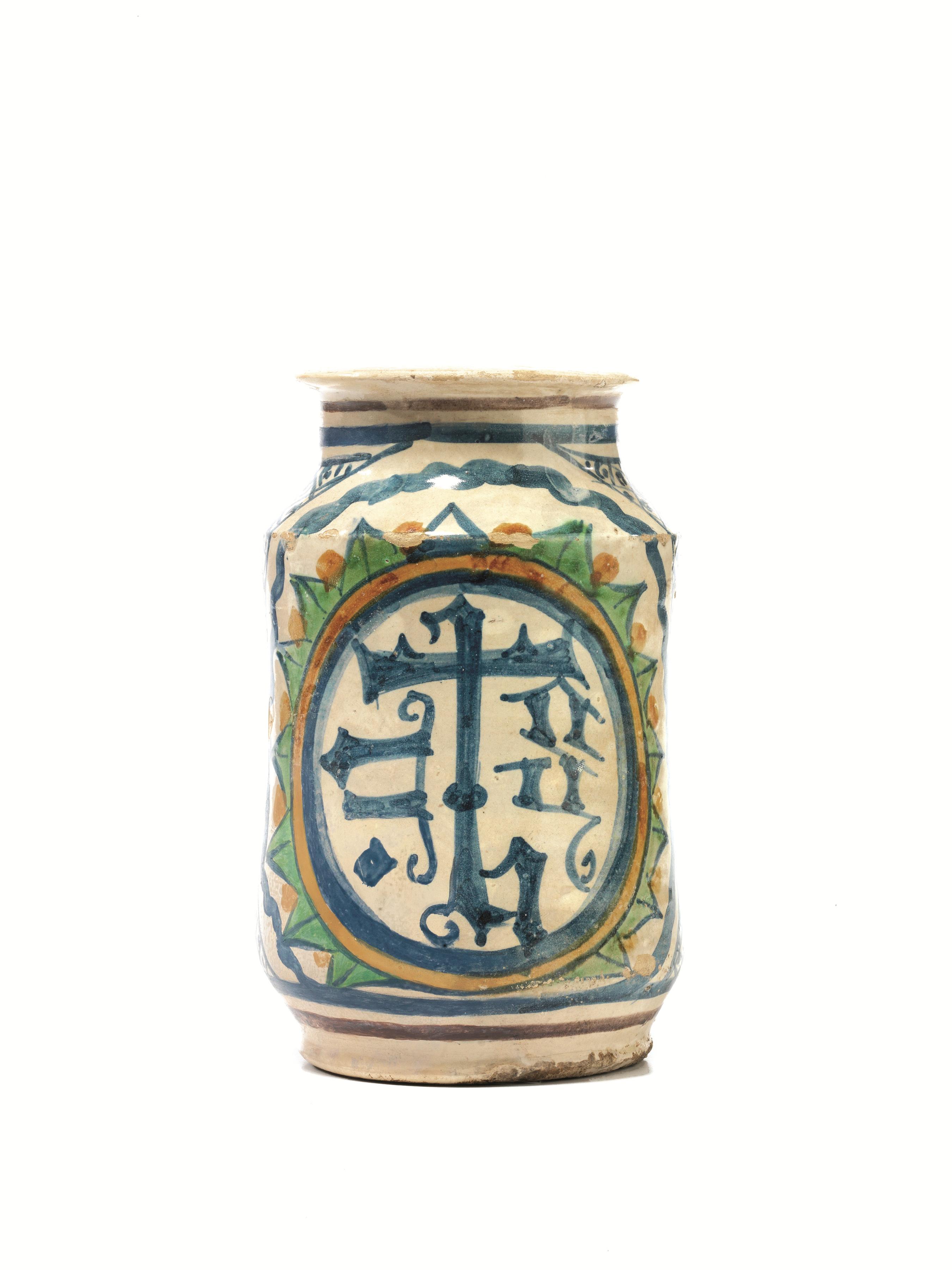 Albarello, Montelupo, sec. XVI, in maiolica, decorata con monogramma bernardiniano entro riserva circolare nei toni del verde, ocra, giallo e blu, alt. cm 17,5, lievi danni