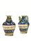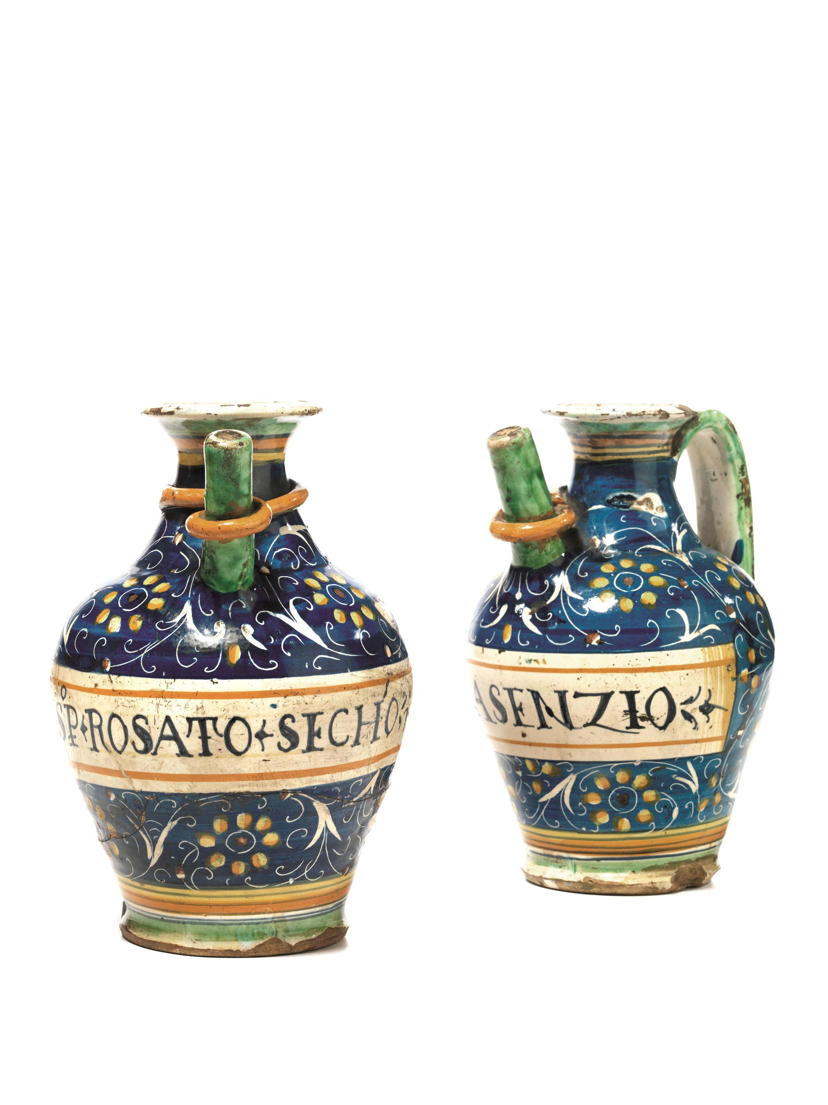 Coppia di versatoi, Montelupo, metà sec. XVI, in maiolica, decorata con girali di foglie e fiori in bianco, giallo e ocra su fondo blu e con iscrizione entro cartiglio, ansa a nastro, pippio con briglia, alt. cm 24,5, piccoli danni e restauri (2)
