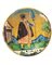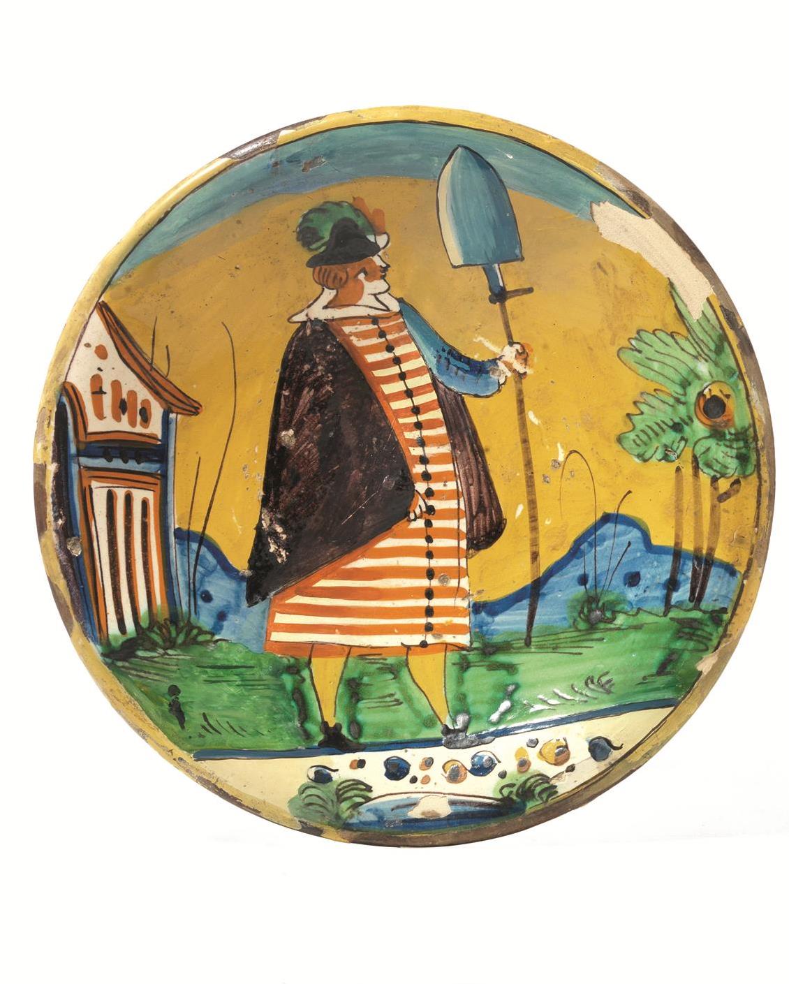 Piatto "Arlecchino", Montelupo, sec. XVII, in maiolica, decorato sull’intera superficie con figura di uomo che impugna una vanga all’interno di un paesaggio con alberi ed edifici nei toni del giallo, azzurro, verde, ocra, labbro dipinto in giallo, diam. cm 25, alcune cadute di colore