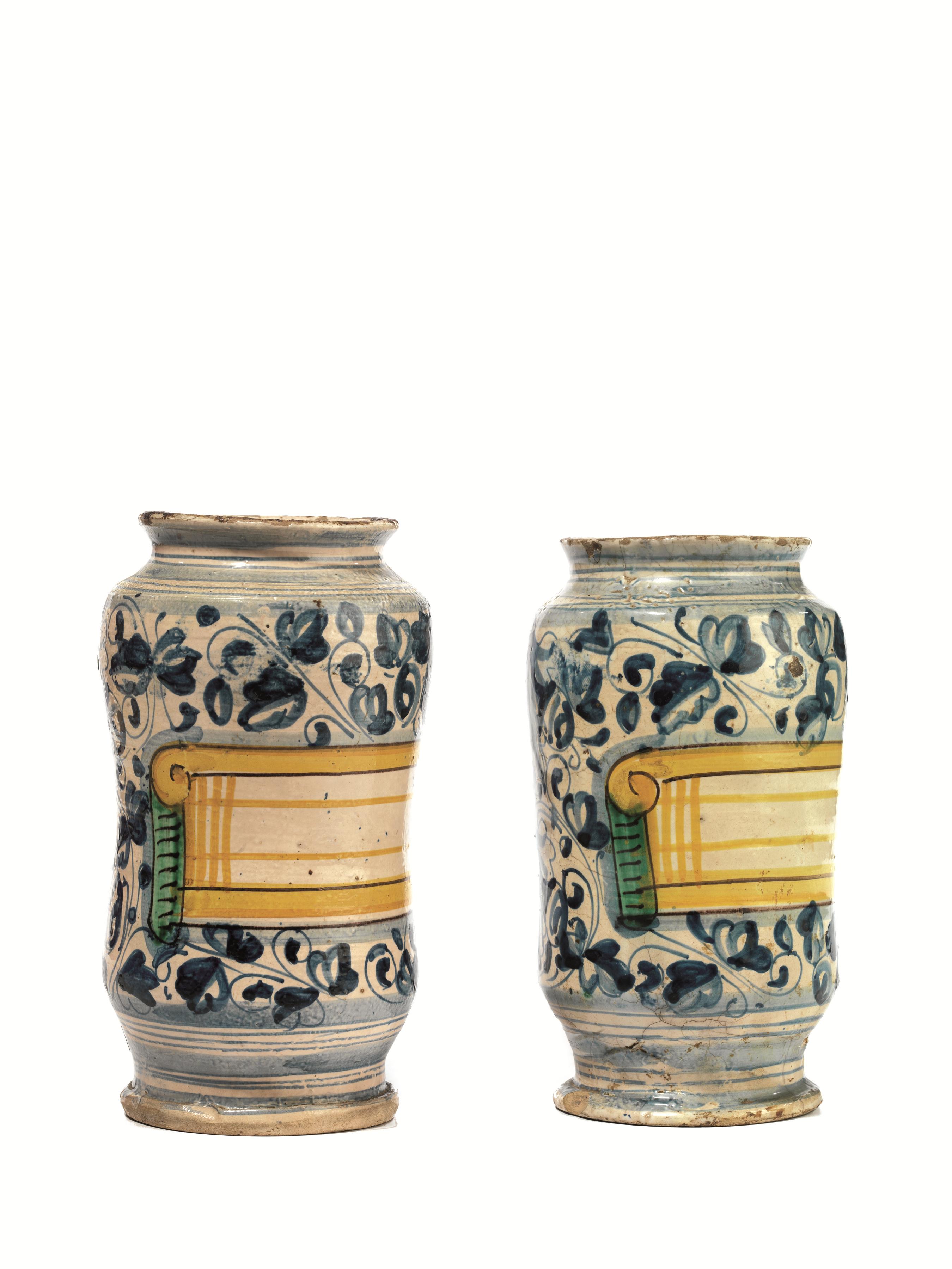 Coppia di albarelli, Montelupo, inizi sec. XVII, in maiolica a decorazione vegetale nei toni del blu e cartiglio verde e giallo anepigrafe, alt. cm 21(2)