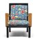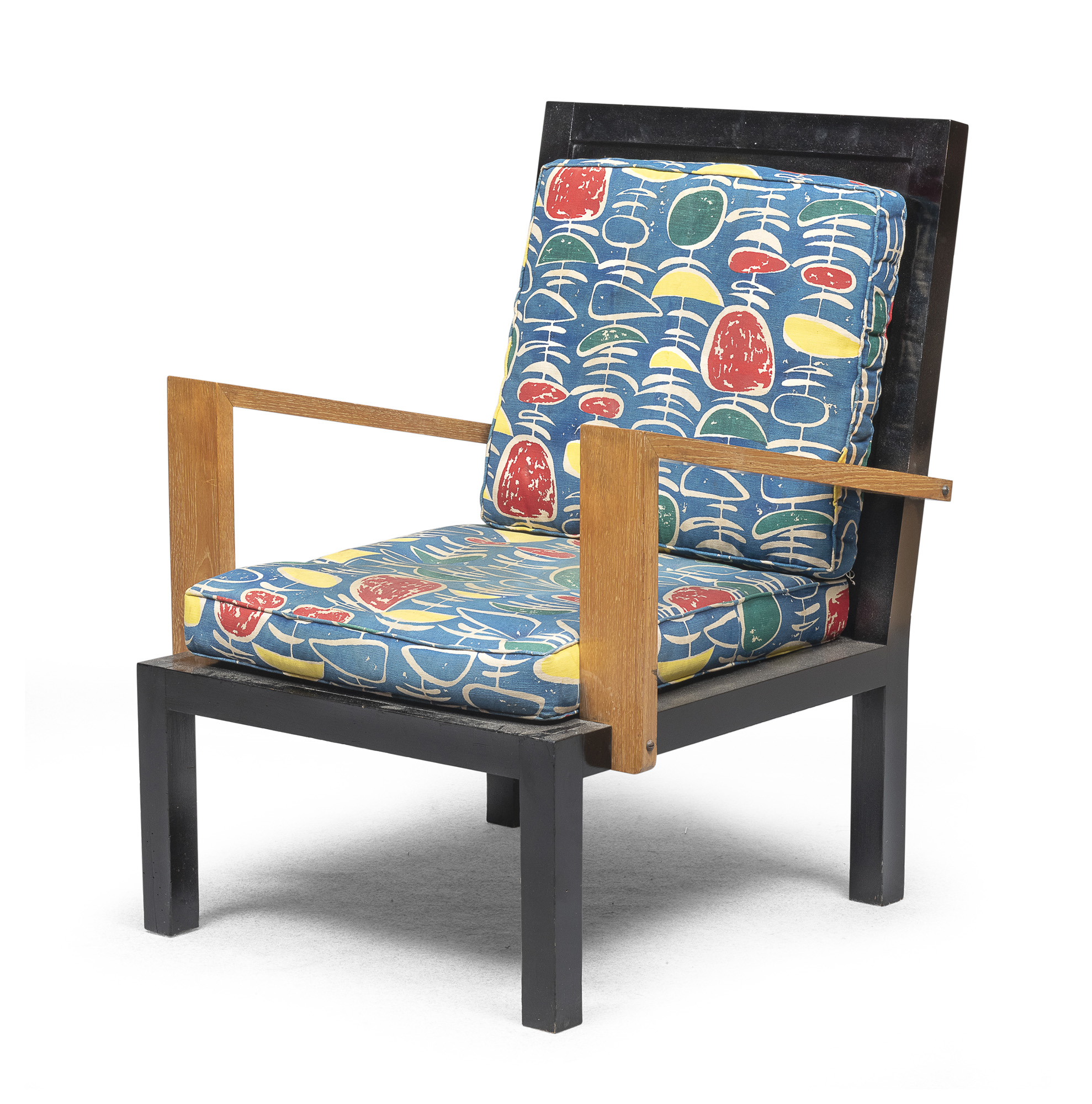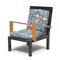 in legno a lacca nera, con braccioli in legno chiaro. Completa di cuscino multicolore.