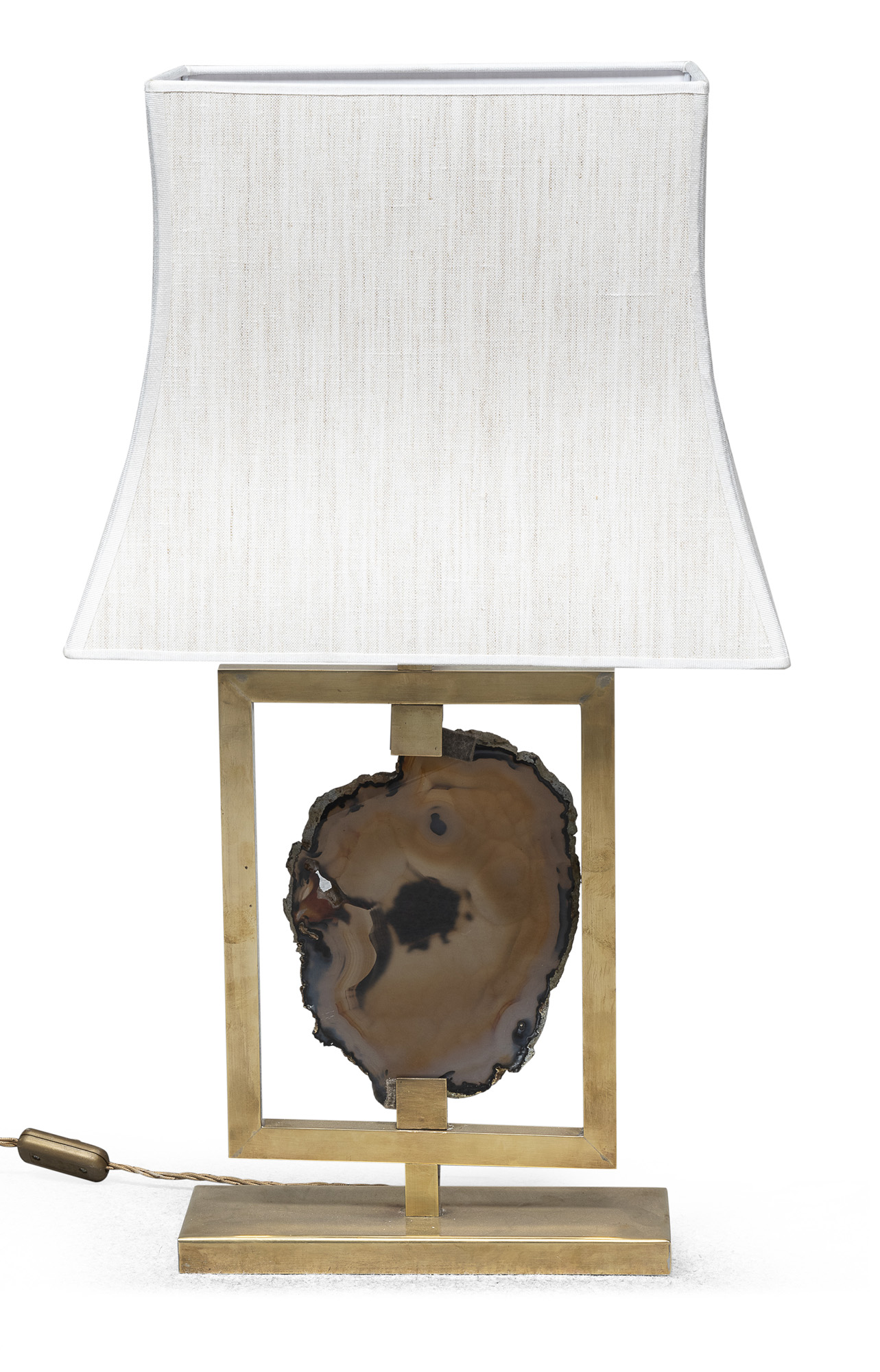 con fusto centrato da inserto in agata. Piede rettangolare, paralume in stoffa bianca.