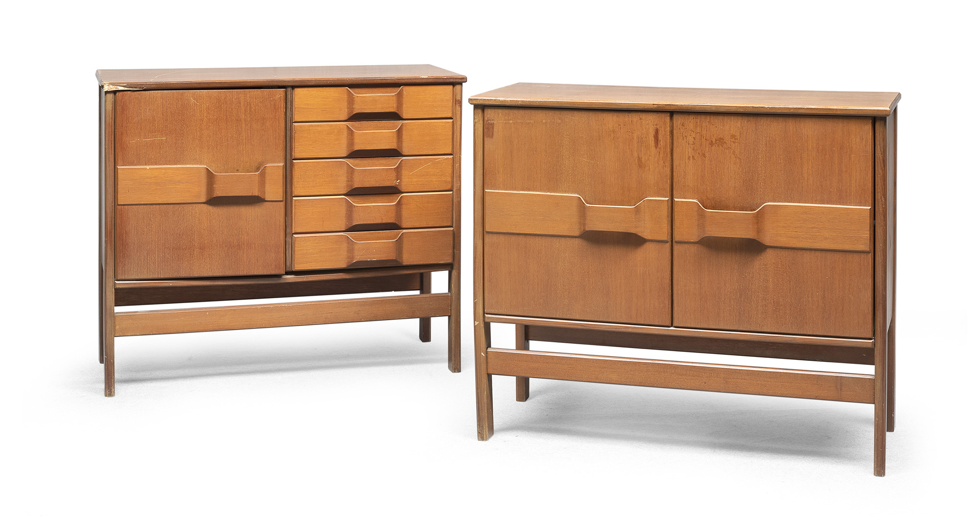 impiallacciate in castagno. Una con fronte a cinque cassetti e sportello, una a due sportelli. Gambe dritte con traversa piatta.