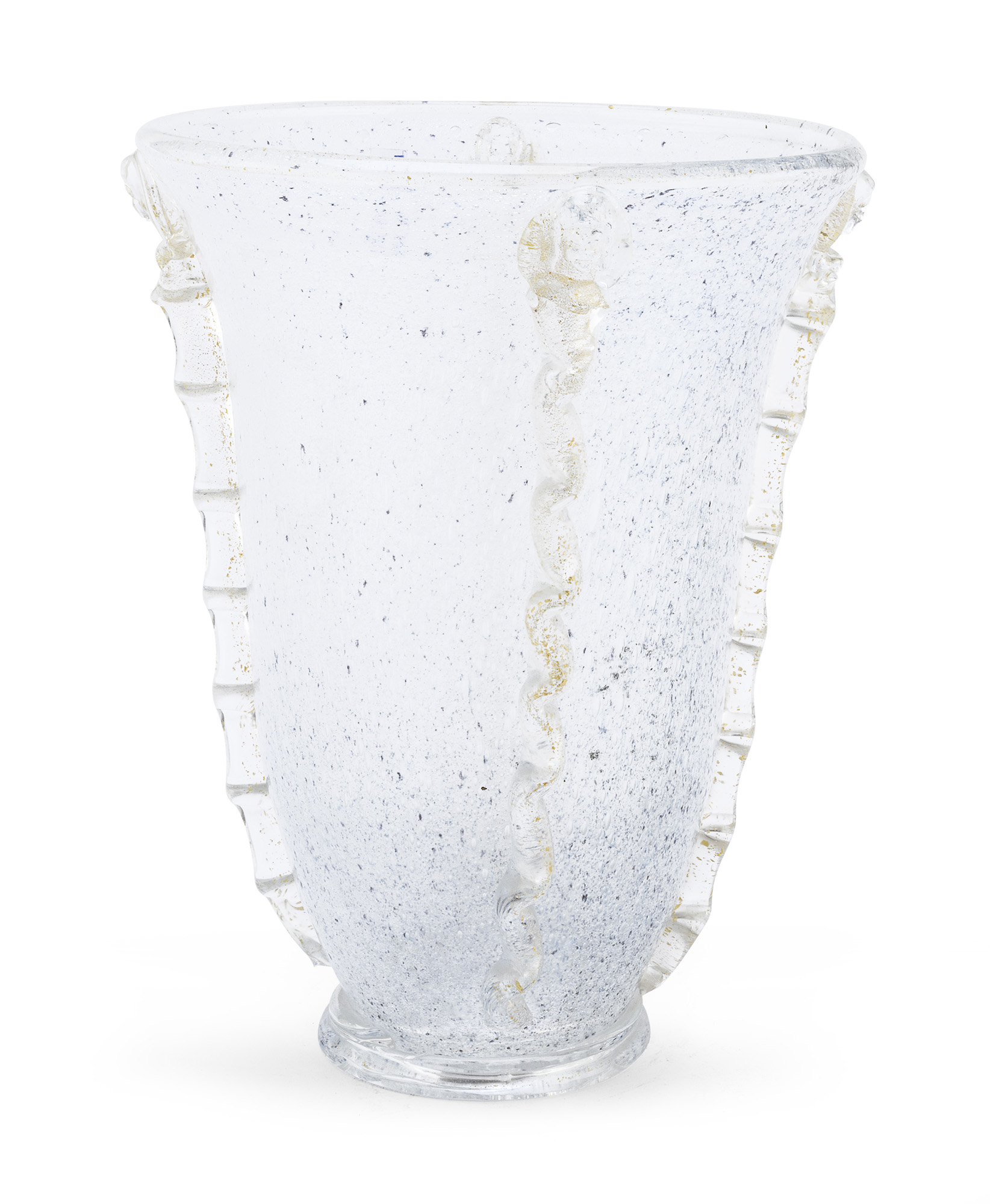 con sagoma a campana ed inclusioni a bollicine a fondo neve. Applicazioni a nastro ondulato in pasta di vetro.
