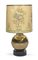 in ottone con paralume in stoffa fiorata e base in plastica nera.