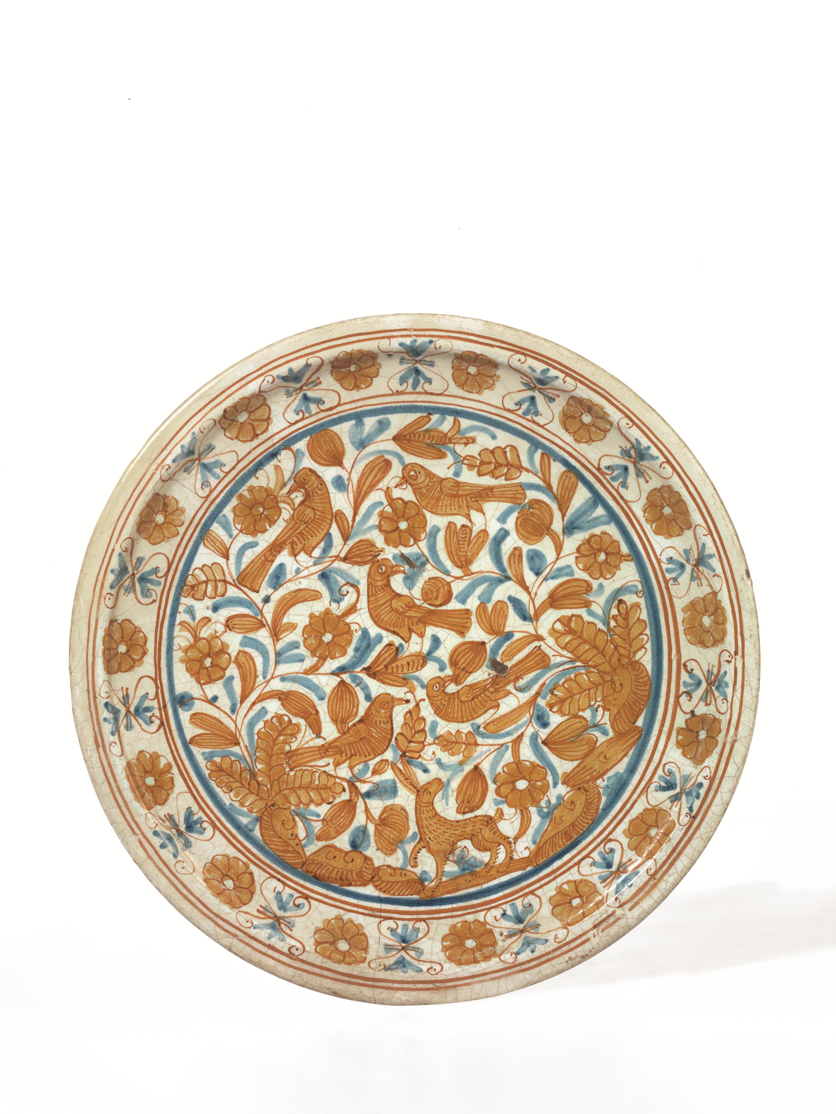 Alzata, Deruta, sec. XVII, in maiolica decorata a motivo vegetale e volatili...