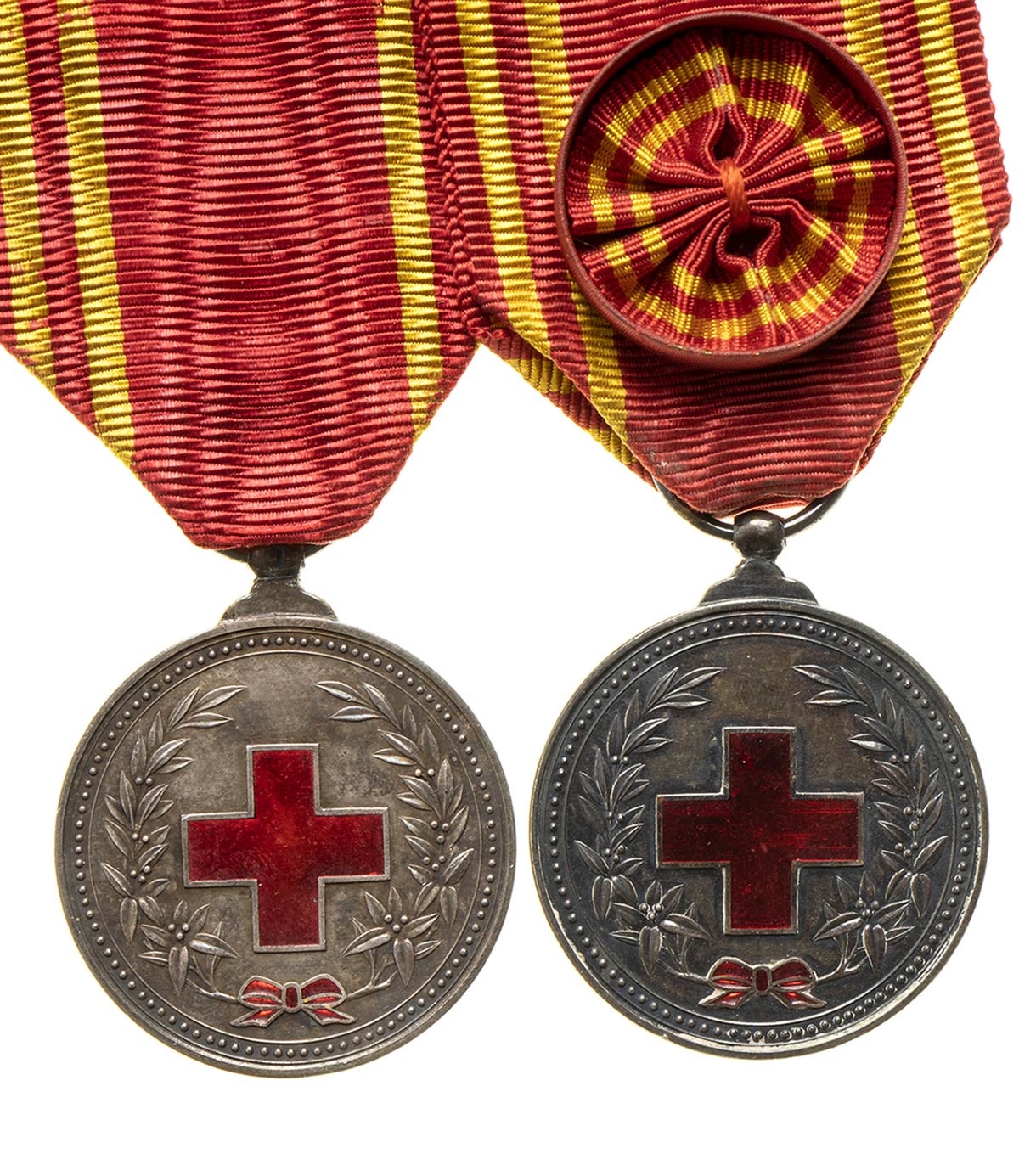 LOTTO DI DUE BELLISSIME MEDAGLIE IN ARGENTO CON BELLA PATINA. AL RECTO GRANDE CROCE ROSSA IN SMALTO TRA FRONDE DI ALLORO, AL VERSO SCRITTE IN IDEOGRAMMI, UNA CON NASTRO E ROSETTA, ALTRA CON NASTRO SEMPLICE CON ATTACCO A GANCIO, NASTRI ORIGINALI.