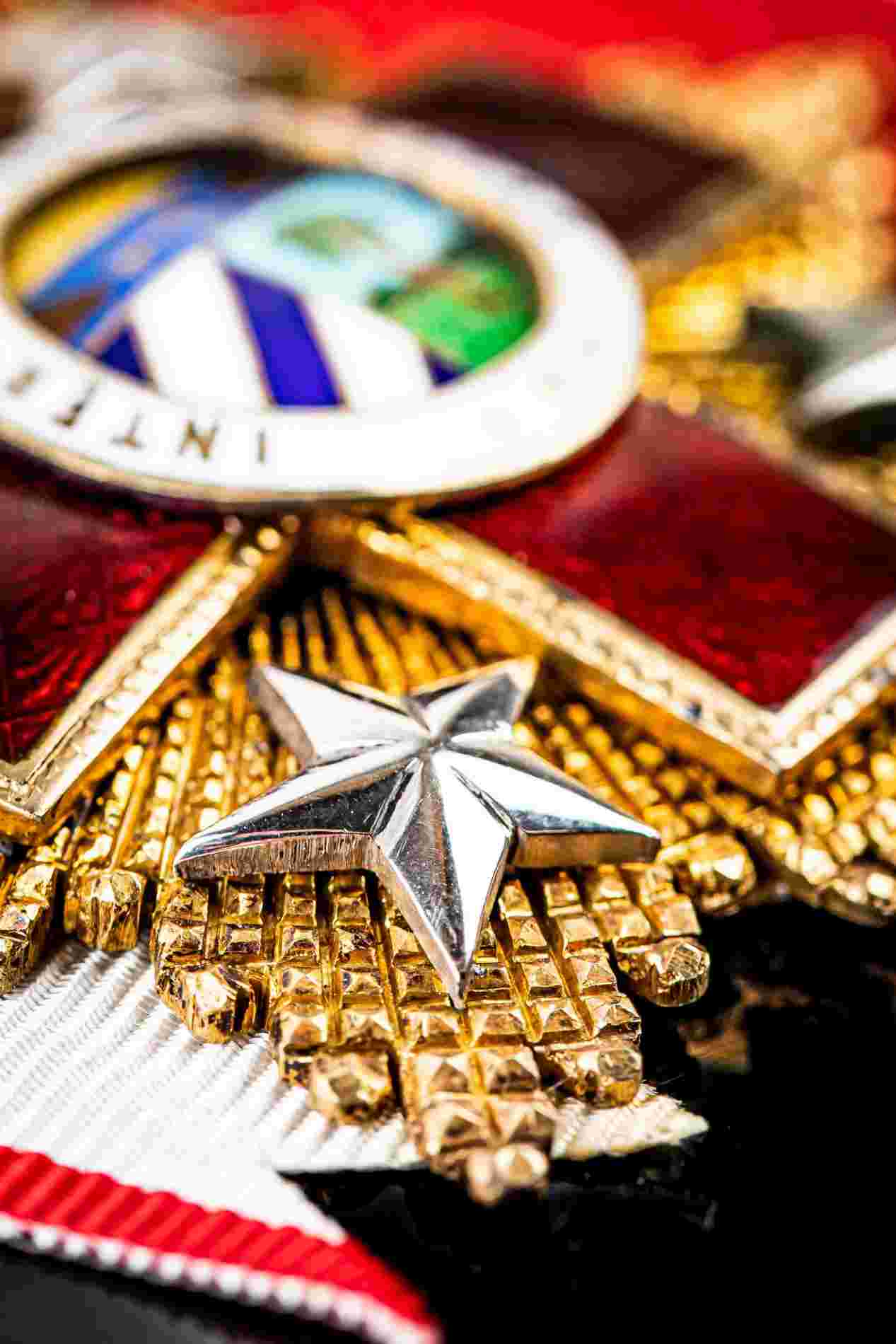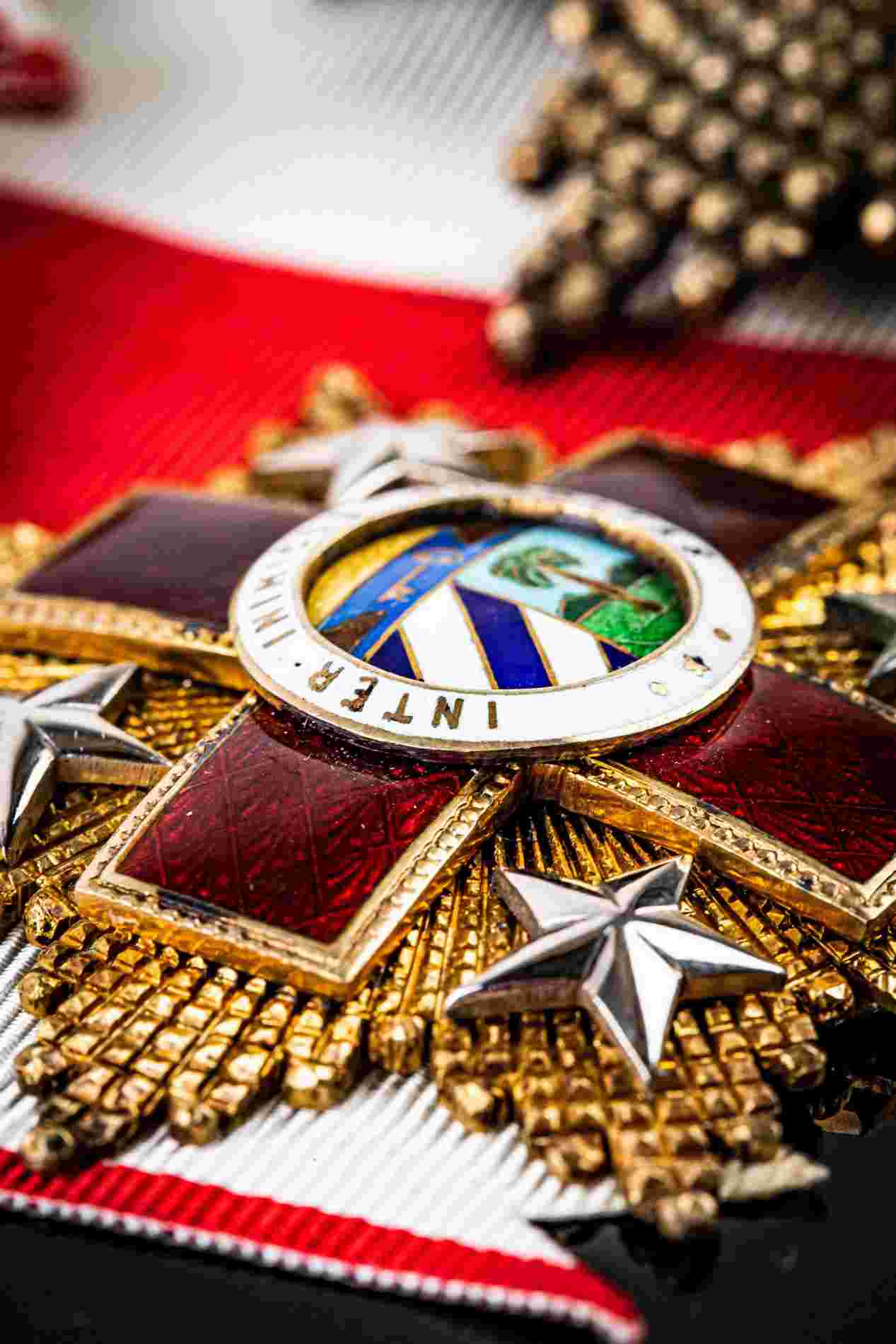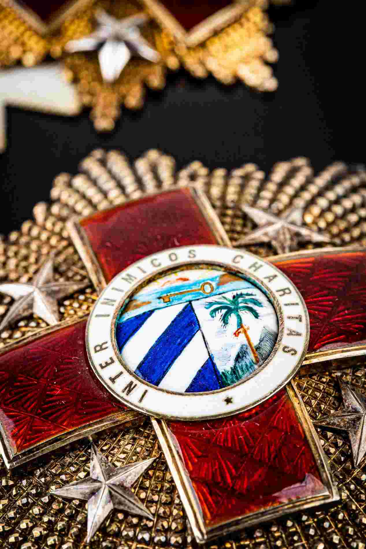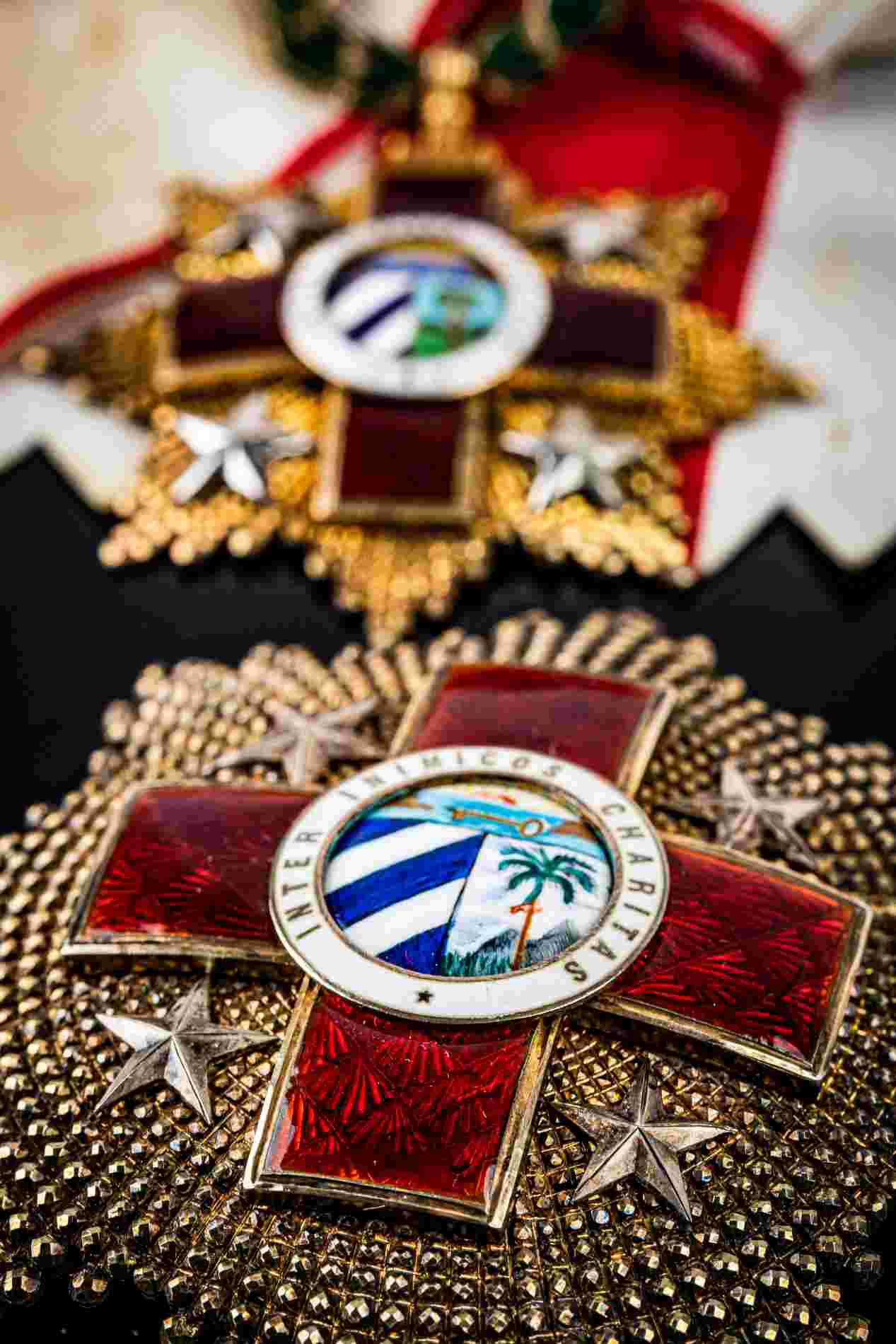 PLACCA E PENDENTE DI GRAN CROCE CON FASCIA DELL’ ORDINE AL MERITO DELLA CROCE ROSSA, ANNI ‘50 CIRCA, AL VERSO MARCHI DEL FABBRICANTE VILAROEBO & RIERO, AVANA