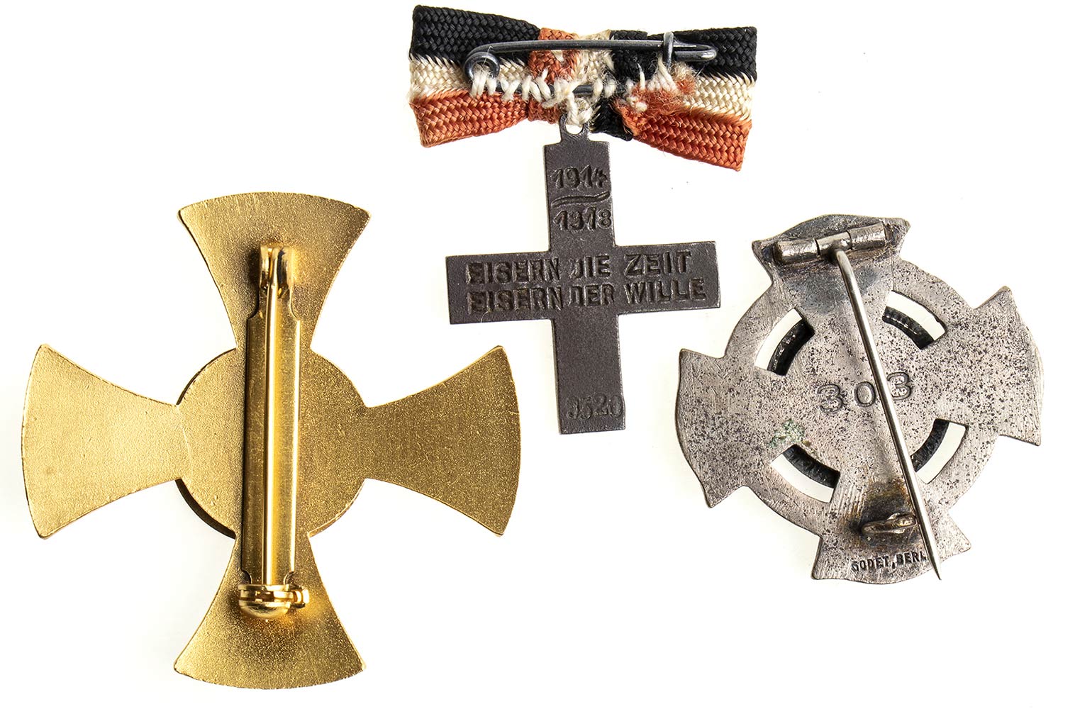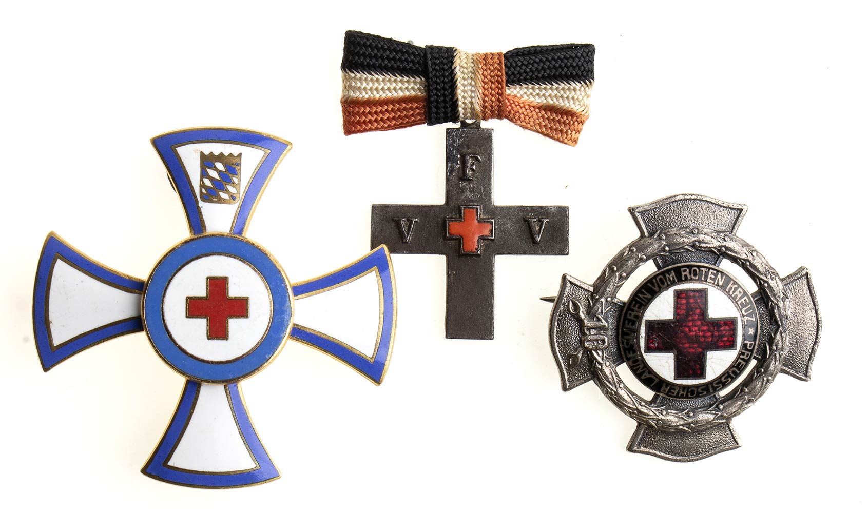 LOTTO COMPOSTO DA DUE DISTINTIVI AL MERITO DI SERVIZIO NELLA CROCE ROSSA BAVARESE DI PRODUZIONE RECENTE, UNO DALLA CROCE ROSSA DI PRUSSIA CON NUMERO DI CONCESSIONE ED UNA MEDAGLIA PER DAMA COMMEMORATIVA DELLA GUERRA 14-18 CON NUMERO DI CONCESSIONE
