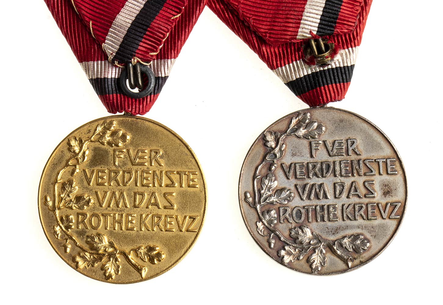 LOTTO DI DUE CROCI AL MERITO DELLA CROCE ROSSA PRUSSIANA, UNA CLASSE ORO NON SMALTATA ED UNA ARGENTO CON SMALTI, NASTRI ORIGINALI