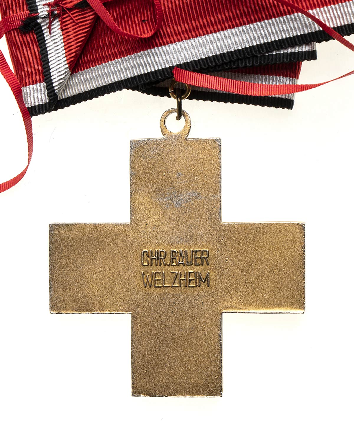 CROCE ROSSA TEDESCA, DECORAZIONE DA COLLO DI PRIMA CLASSE, IN BRONZO DORATO, NASTRO INTEGRO E COEVO , NESSUNA SCHEGGIATURA AGLI SMALTI.