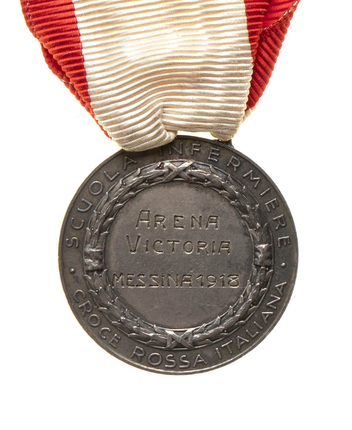 MEDAGLIA PER INFERMIERA VOLONTARIA DELLA CRI, ARGENTO CON APPLICAZIONI IN SMALTO ROSSO, MESSINA 1918 E NOME DELL’INSIGNITA