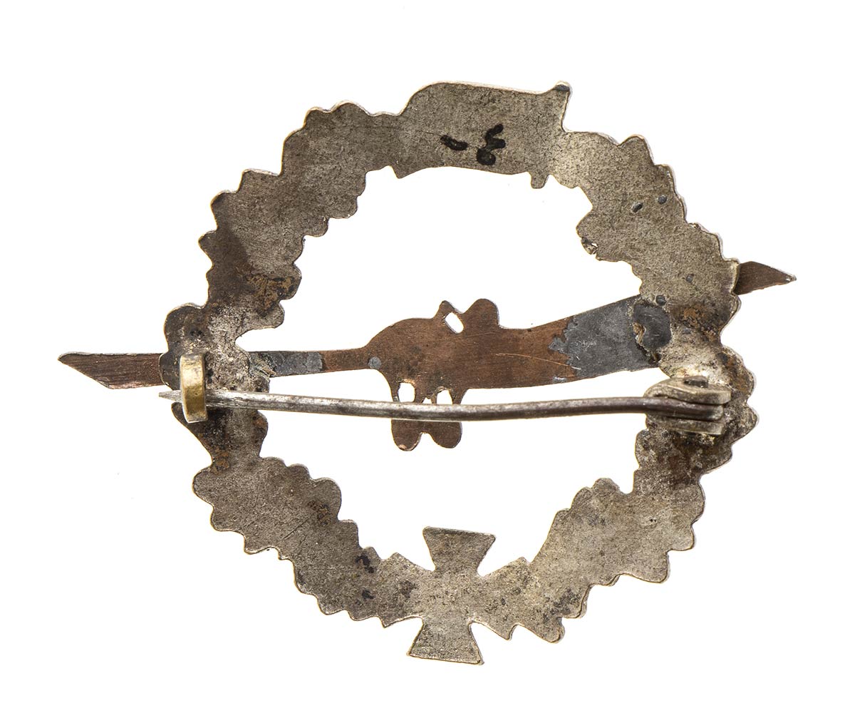 DISTINTIVO DA PILOTA , AEREO MONOPLANO TRA SERTO DI FOGLIE DI QUERCIA SOTTO BANDIERA DELL’IMPERIAL REGIA MARINA
