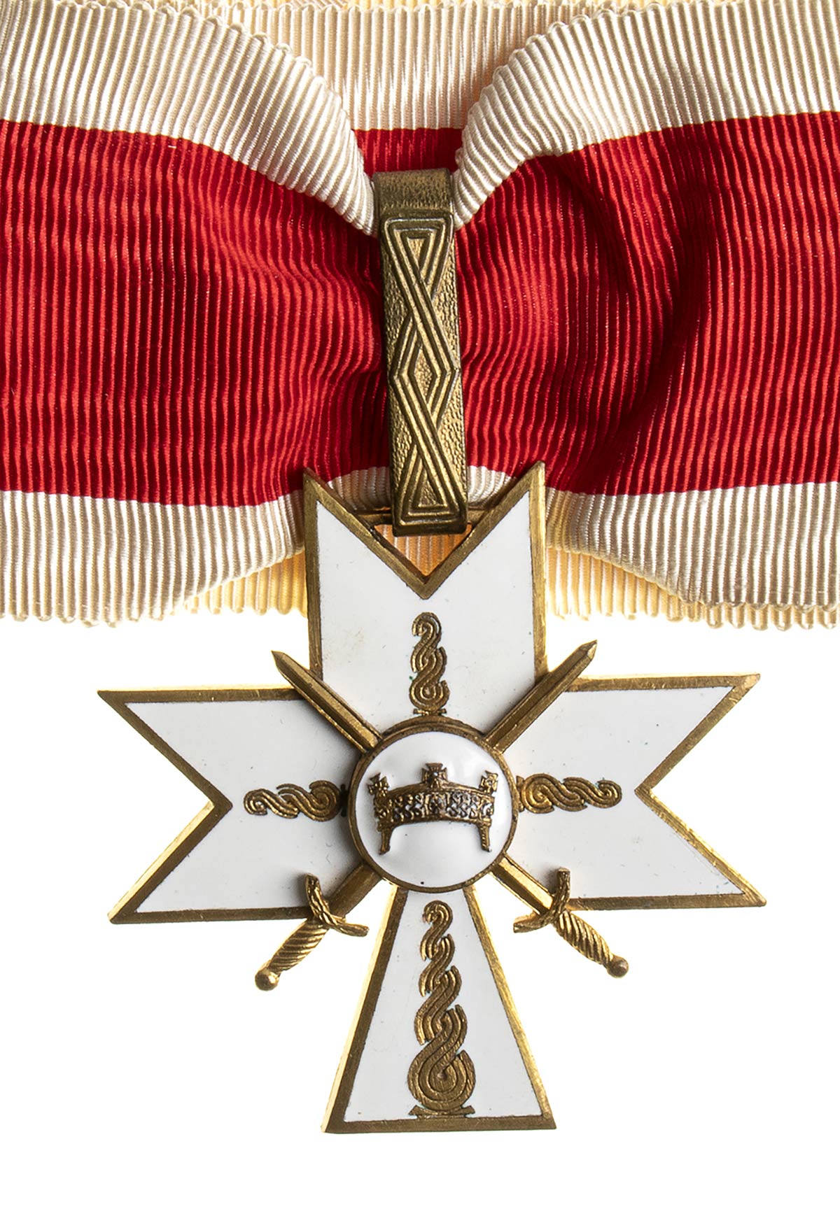 ORDINE DELLA CORONA DI RE SVONIMIRO DI PRIMA CLASSE CON SPADE PER MERITI MILITARI, BRONZO DORATO E SMALTI, NASTRO BIANCO ROSSO IN SETA, ORIGINALE