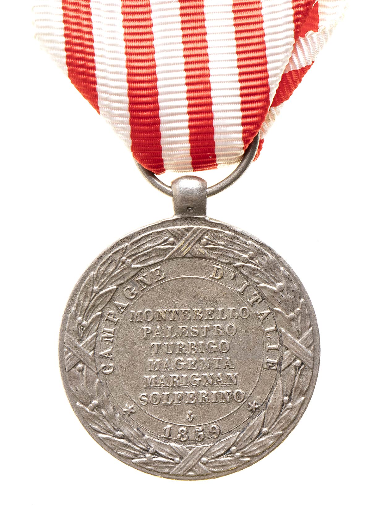 MEDAGLIA COMMEMORATIVA DELLA CAMPAGNA IN ITALIA DEL 1859, FIRMATA BARRE, NASTRO COERENTE, NON COEVO