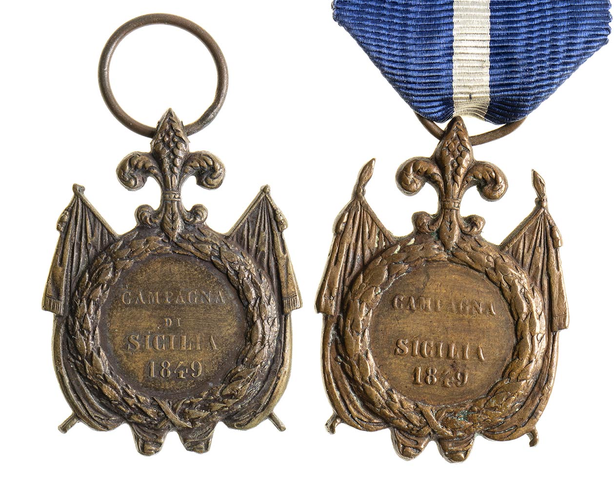 CONIATA PER PREMIARE I MILITARI CHE AVEVANO PARTECIPATO ALLA CAMPAGNA DI SICILIA DEL 1849, UNA DELLE DUE MANCANTE DELLE PUNTE DELLE LANCE, UNA CON LANCE E NASTRINO APPARENTEMENTE COEVO.