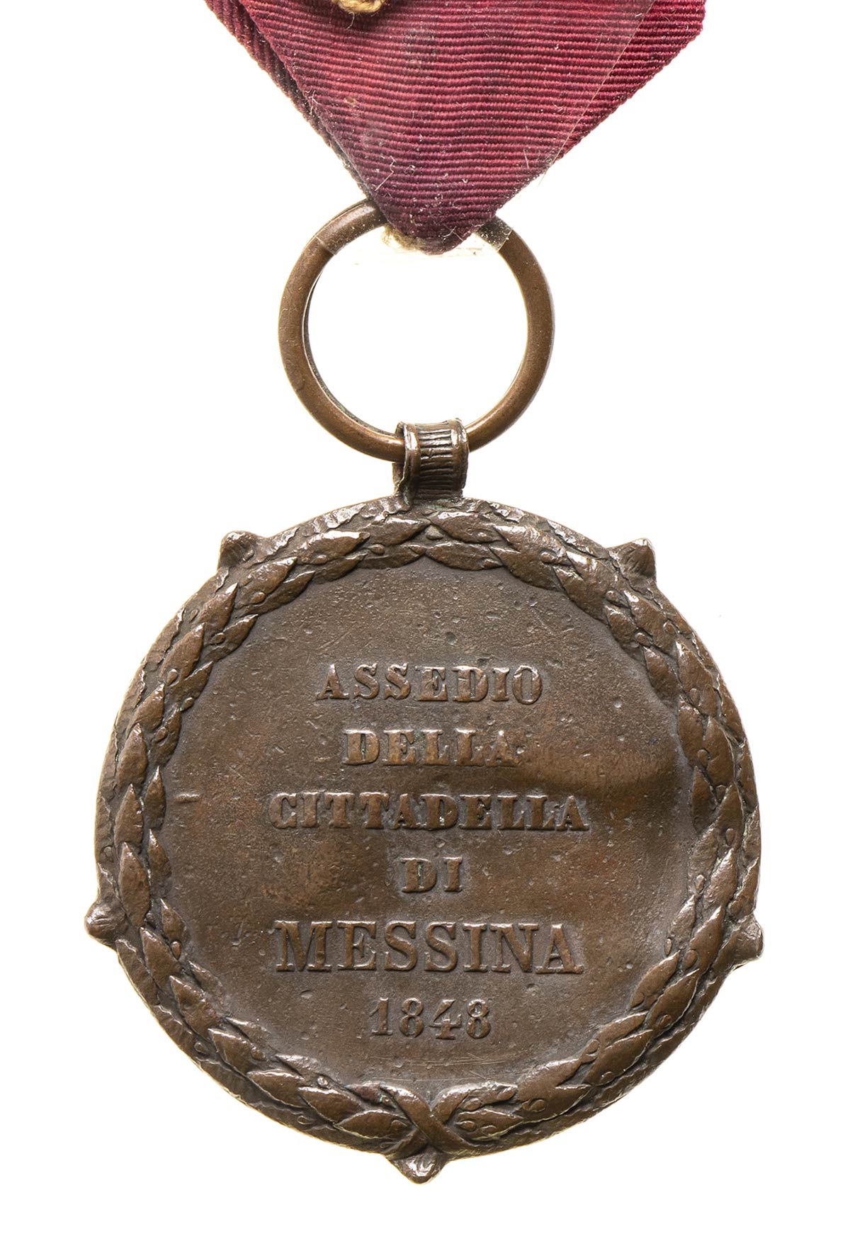 MEDAGLIA IN BELLA PATINA, PORTATA, CONIATA IN OCCASIONE DELL’ASSEDIO DELLA CITTADELLA DI MESSINA DEL 1848, BRONZO CON CURIOSA DEFORMAZIONE CON AFFOSSAMENTO DEL CONIO AL VERSO DELLA MEDAGLIA, LA MEDAGLIA NON È IN FUSIONE. NASTRO ORIGINALE