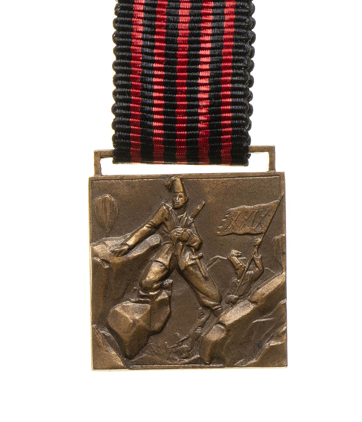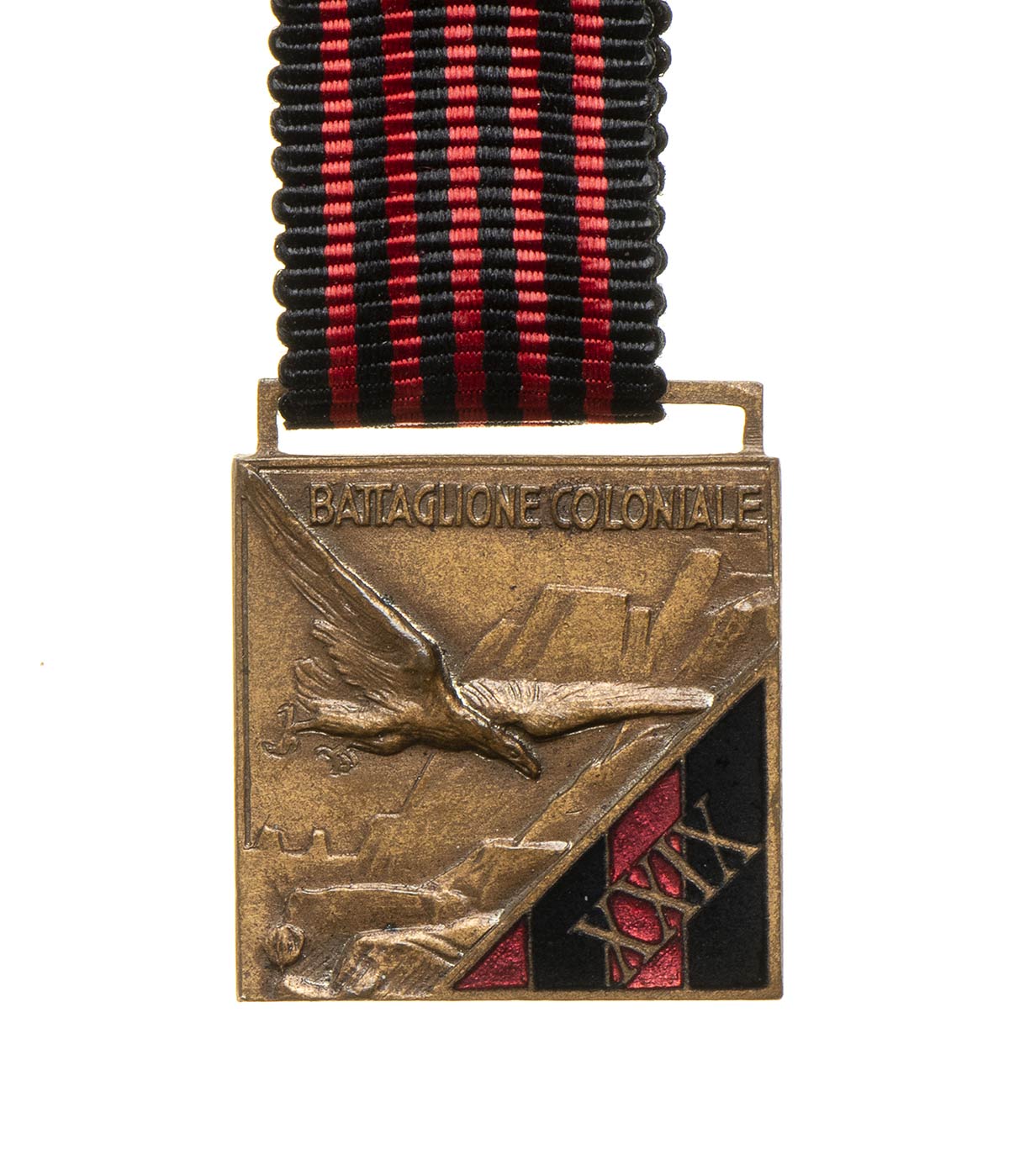 BELLISSIMA MINIATURA DELLA MEDAGLIA COMMEMORATIVA DEL XXIX BATTAGLIONE ARABO SOMALO, BRONZO E SMALTI ROSSO-NERI, NASTRO COEVO, FIOR DI CONIO