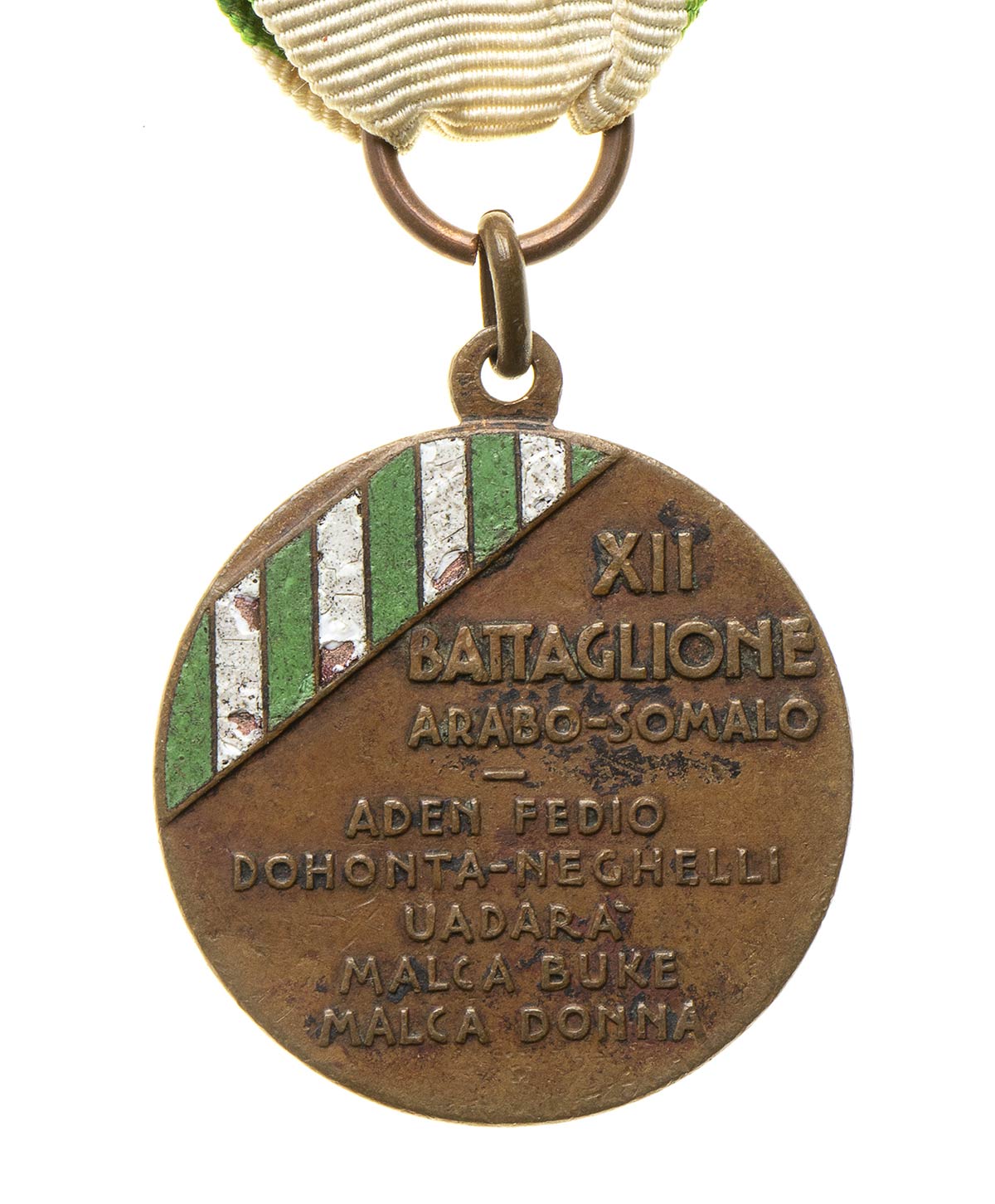 MEDAGLIA DI BRONZO DEL XII BATTAGLIONE ARABO SOMALO, LEOPARDO SOVRAPPOSTO A FIAMMA, AL VERSO FASCIA DISTINTIVA IN SMALTI CON ROTTURE E MANCANZE, NASTRO ORIGINALE
