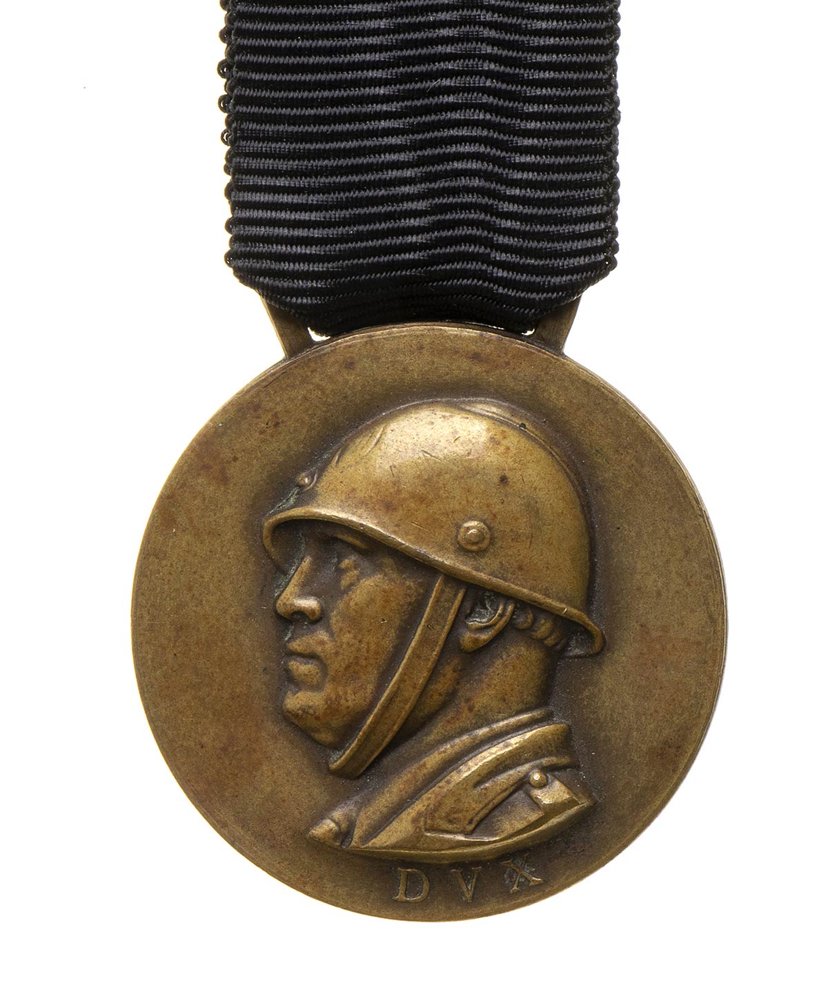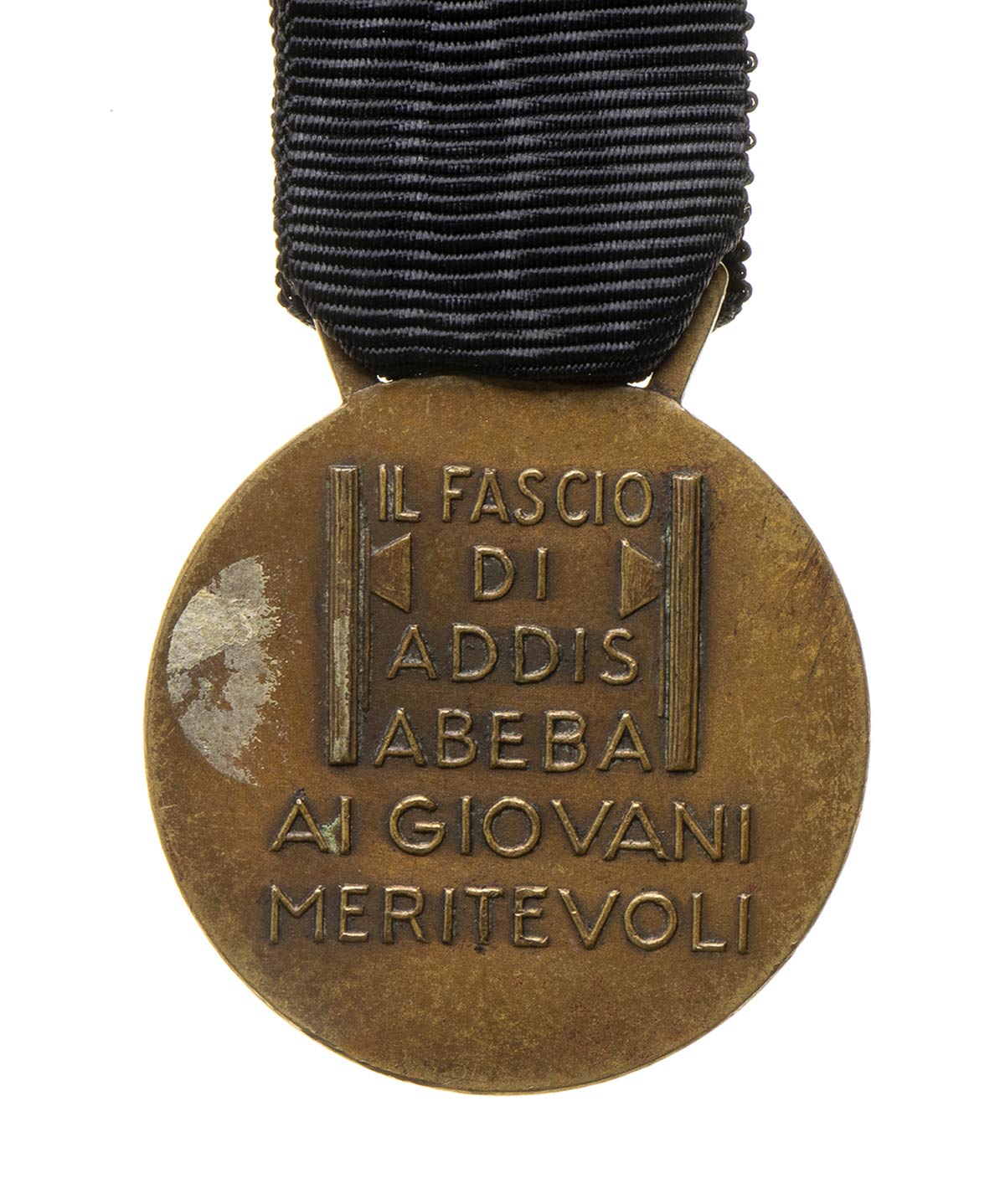 MEDAGLIA IN BRONZO CON EFFIGIE DI BENITO MUSSOLINI CON ELMO, AL VERSO SCRITTA DEDICATORIA DEL FASCIO DI ADDIS ABEBA AI GIOVANI MERITEVOLI TRA DUE FASCI LITTORI, NASTRO NERO APPARENTEMENTE COEVO