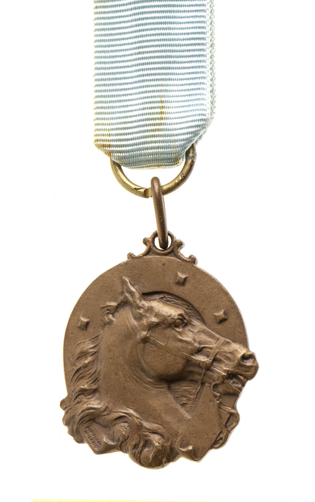BELLISSIMA MEDAGLIA IN BRONZO E SMALTI RAFFIGURANTE TESTA DI CAVALLO ENTRO FERRO, AL VERSO FREGIO DEL SERVIZIO VETERINARIO IN SMALTO, NASTRO ORIGINALE