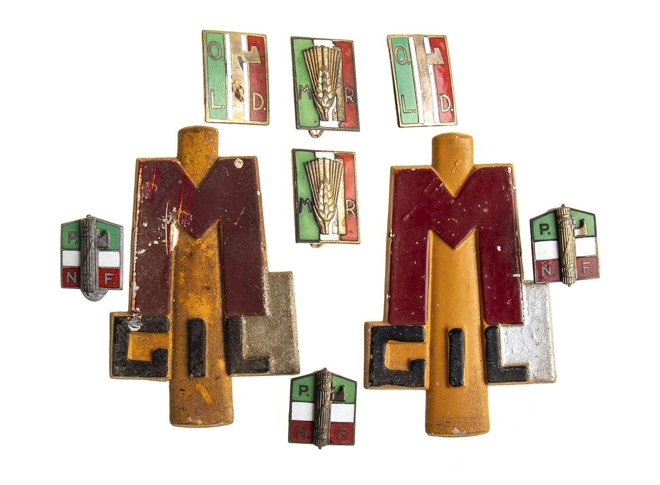 LOTTO COMPOSTO DA DUE FREGI GIL IN ALLUMINIO DIPINTO, TRE DISTINTIVI PNF, DUE DELLE MASSAIE RURALI E DUE DELL'ORGANIZZAZIONE LAVORATORI A DOMICILIO