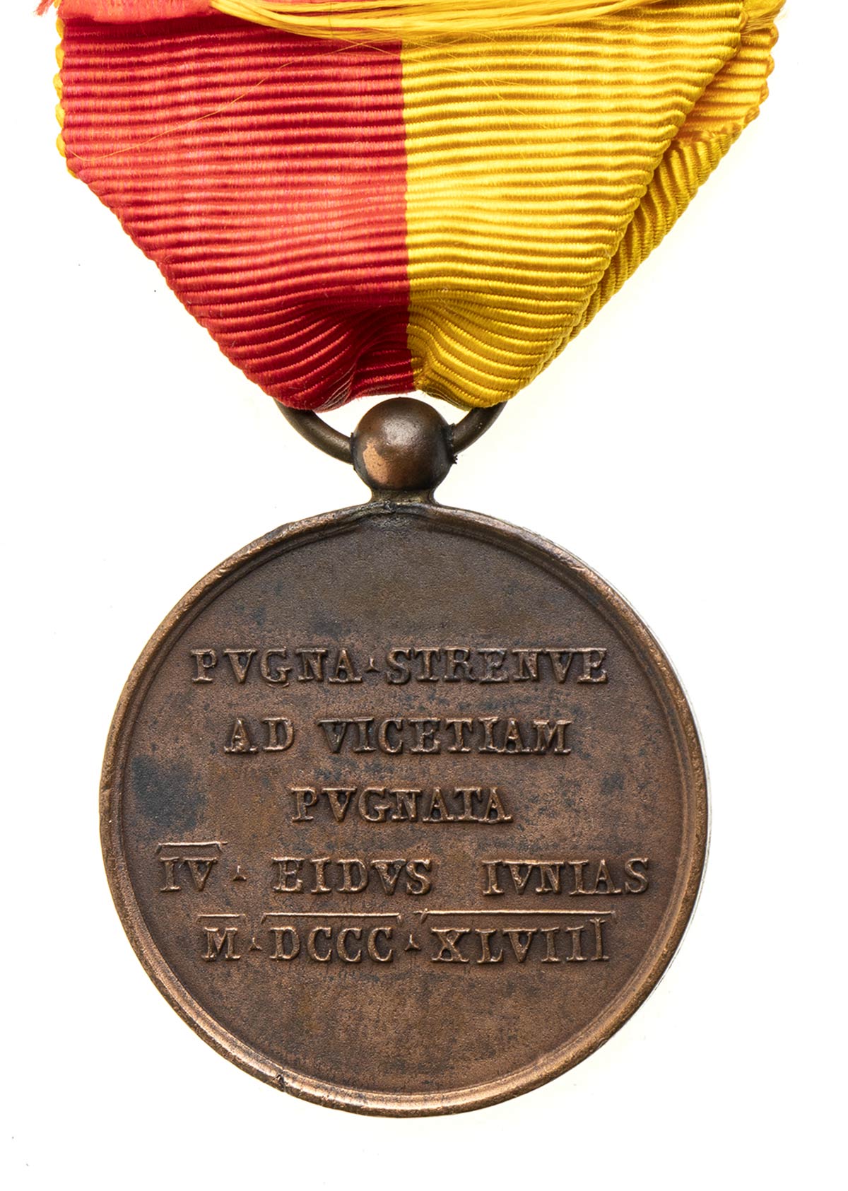 MEDAGLIA DI BENEMERENZA PER I ROMANI ACCORSI IN DIFESA DELLA CITTA’ DI VICENZA, 1848, NASTRO CORRETTO MA NON ORIGINALE