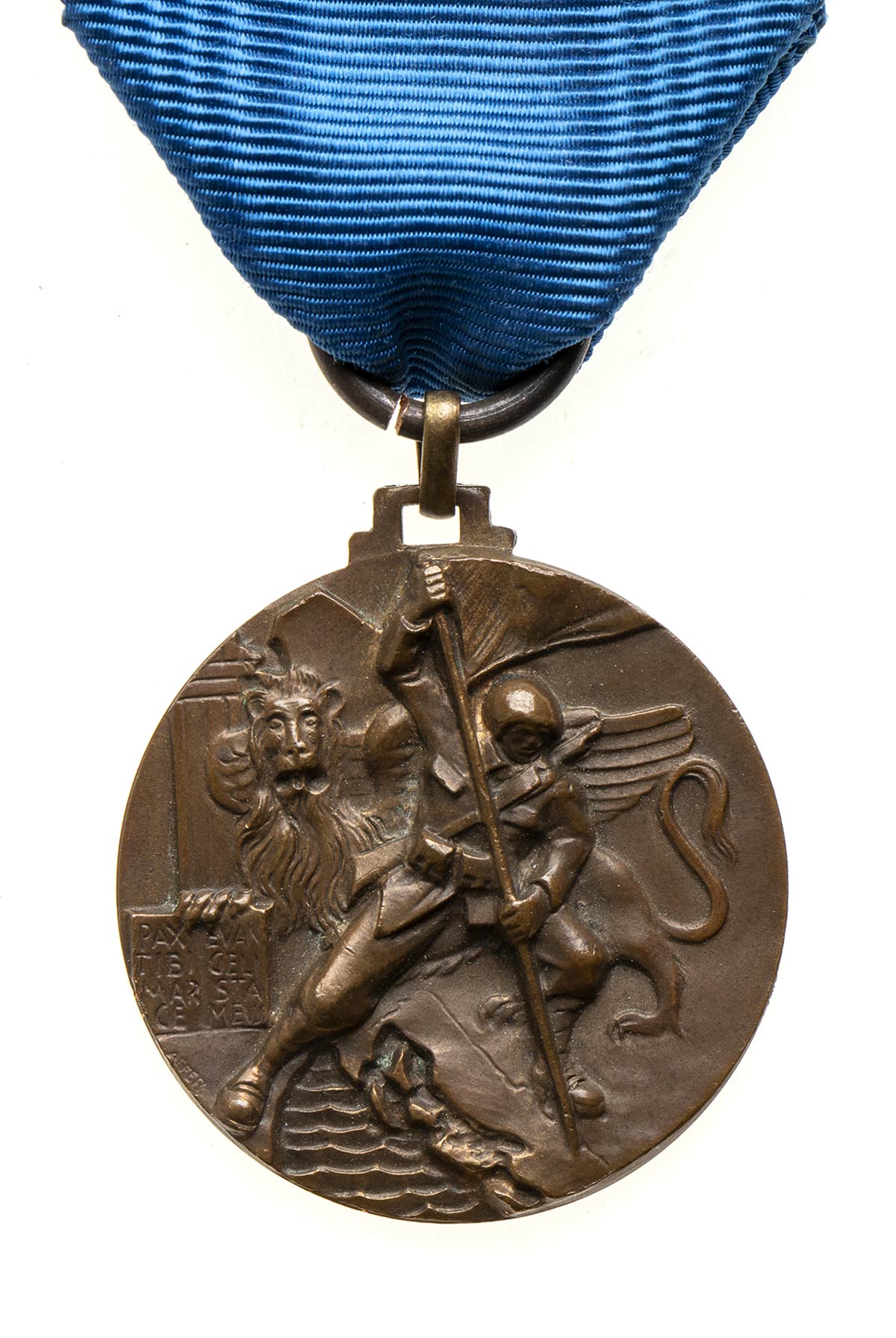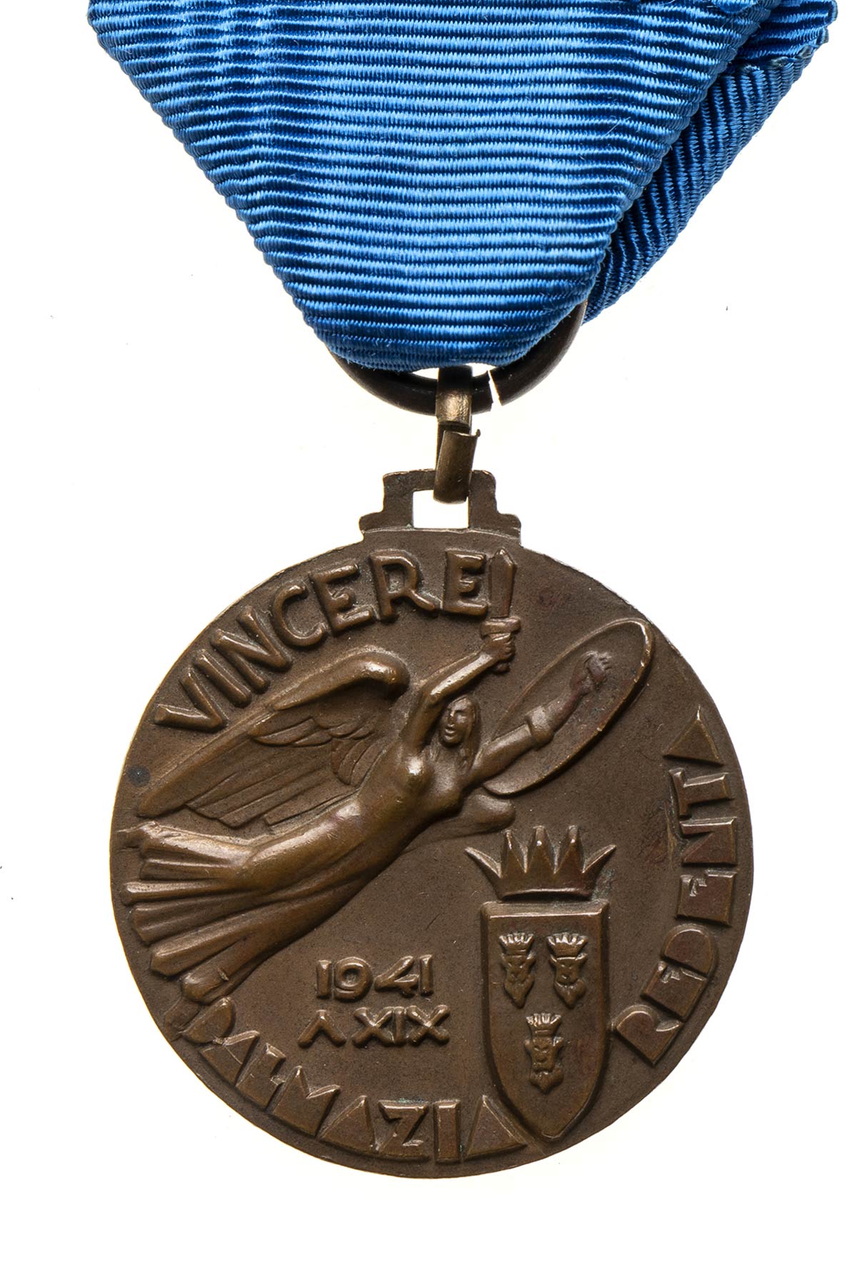MEDAGLIA IN BRONZO CON ALLEGORIA DELLA VITTORIA SU SCUDO DALMATA, DALMAZIA REDENTA, AL VERSO LEONE DI SAN MARCO E LEGIONARIO CHE PIANTA VESSILLO SU SUOLO DALMATA, MEDAGLIA EMESSA NEL 1941