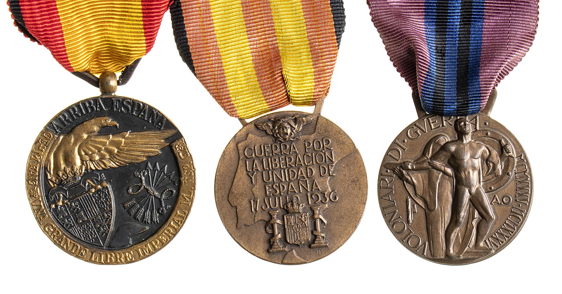 LOTTO COMPOSTO DA UNA MEDAGLIA PER VOLONTARI DI GUERRA AO, UNA CAMPAGNA DI SPAGNA BIMETALLICA ED UNA COMMEMORATIVA IL GIORNO DELL’ALZAMIENTO, TUTTE CON NASTRI ORIGINALI