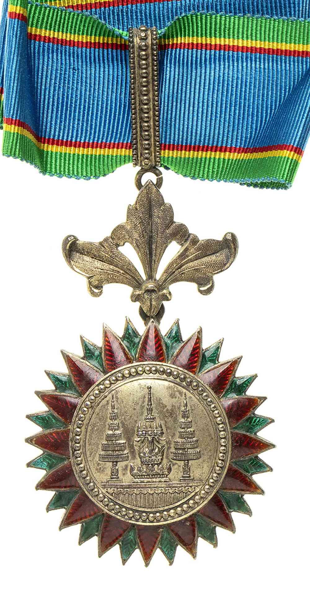 ORDINE DELLA CORONA DI THAILANDIA, IN ARGENTO E SMALTI ROSSO-VERDI, NASTRO ORIGINALE. ANNI 30 DEL XX SEC.