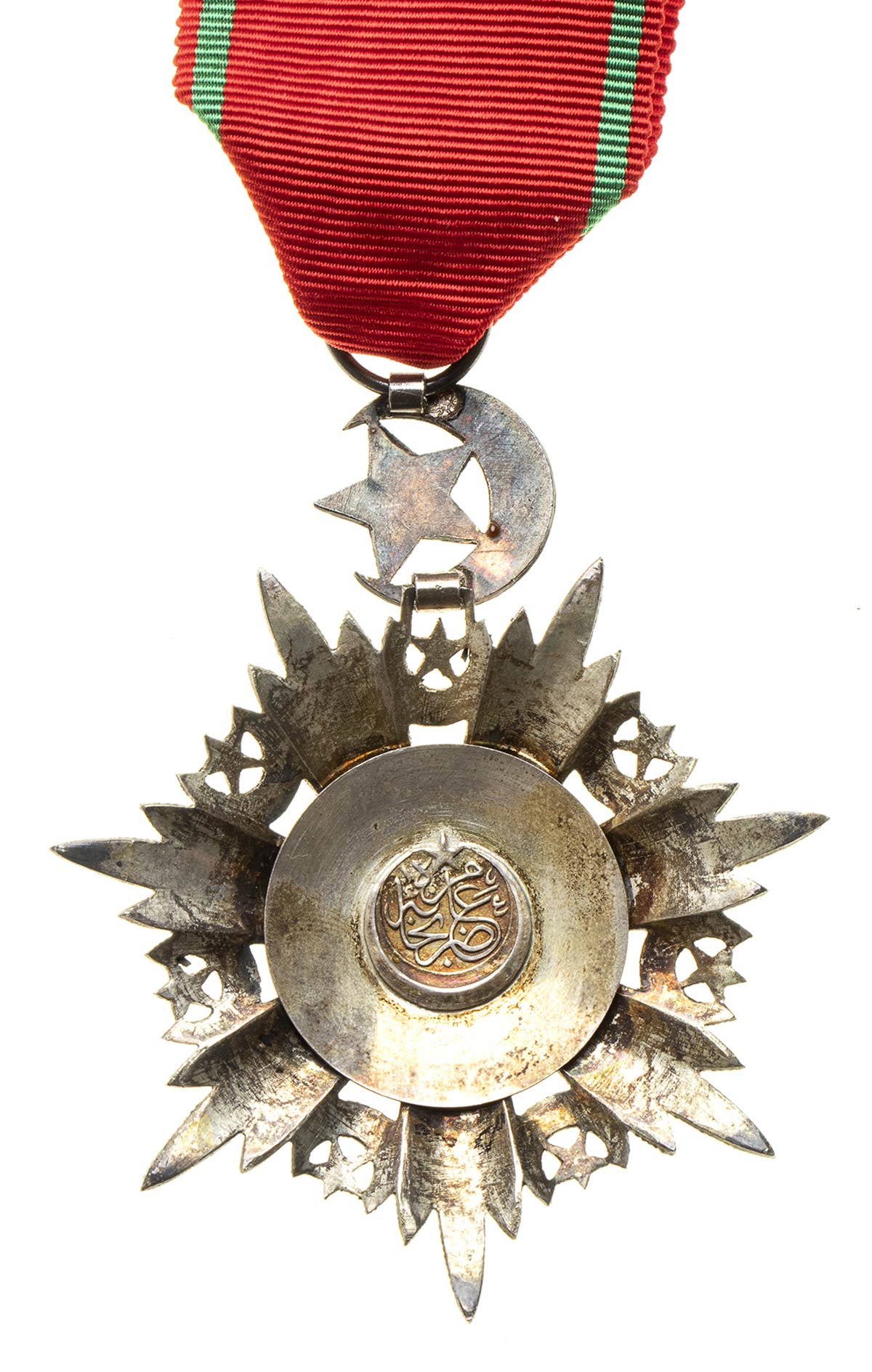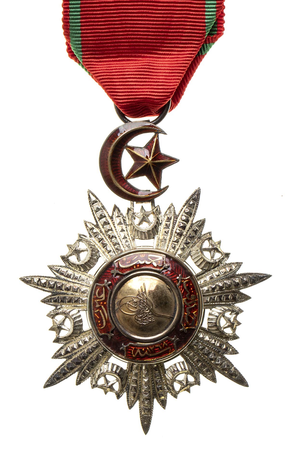 BELLISSIMA INSEGNA DELL’ORDINE IN ARGENTO GETTATO, CESELLATO ED INCISO, AL CENTRO TUGHRA SULTANIALE SU DISCO D’ORO CIRCONDATA DA CARTIGLIO IN SMALTO ROSSO, IL TUTTO APPESO A CRESCENTE IN SMALTO ROSSO. L’ORDINE È MONTATO COME UNA QUARTA CLASSE, MA DATE LE DIMENSIONI POTREBE ESSERE UN PENDENTE DI GRAN CROCE, OTTIMA FATTURA, MARCATA AL VERSO, NASTRO ORIGINALE.
