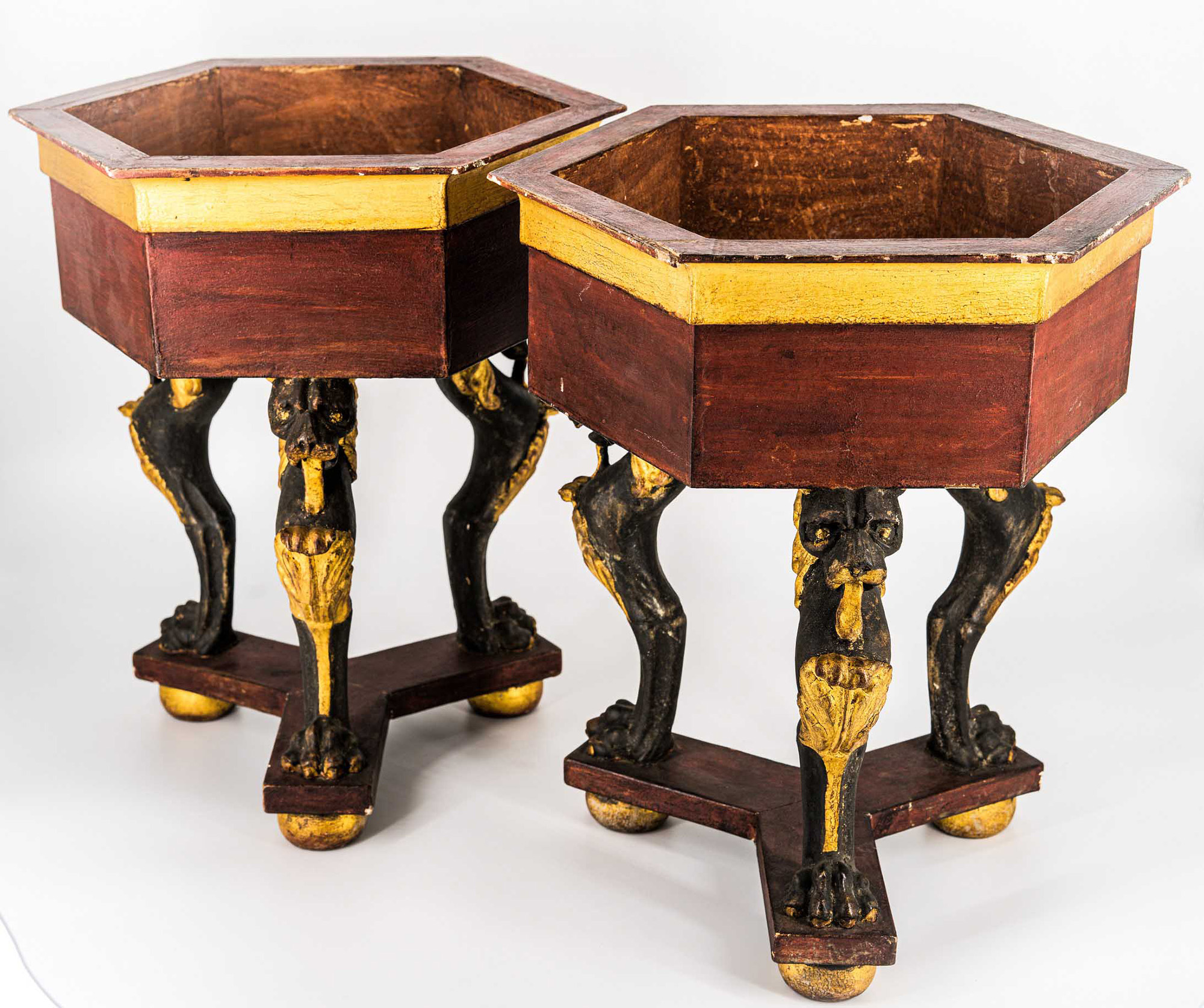 in legno intagliato, laccato rosso, nero e oro, parte superiore esagonale su tre sostegni con teste e zampe leonine che appoggiano su una crociera triangolare, zampe a sfera schiacciata