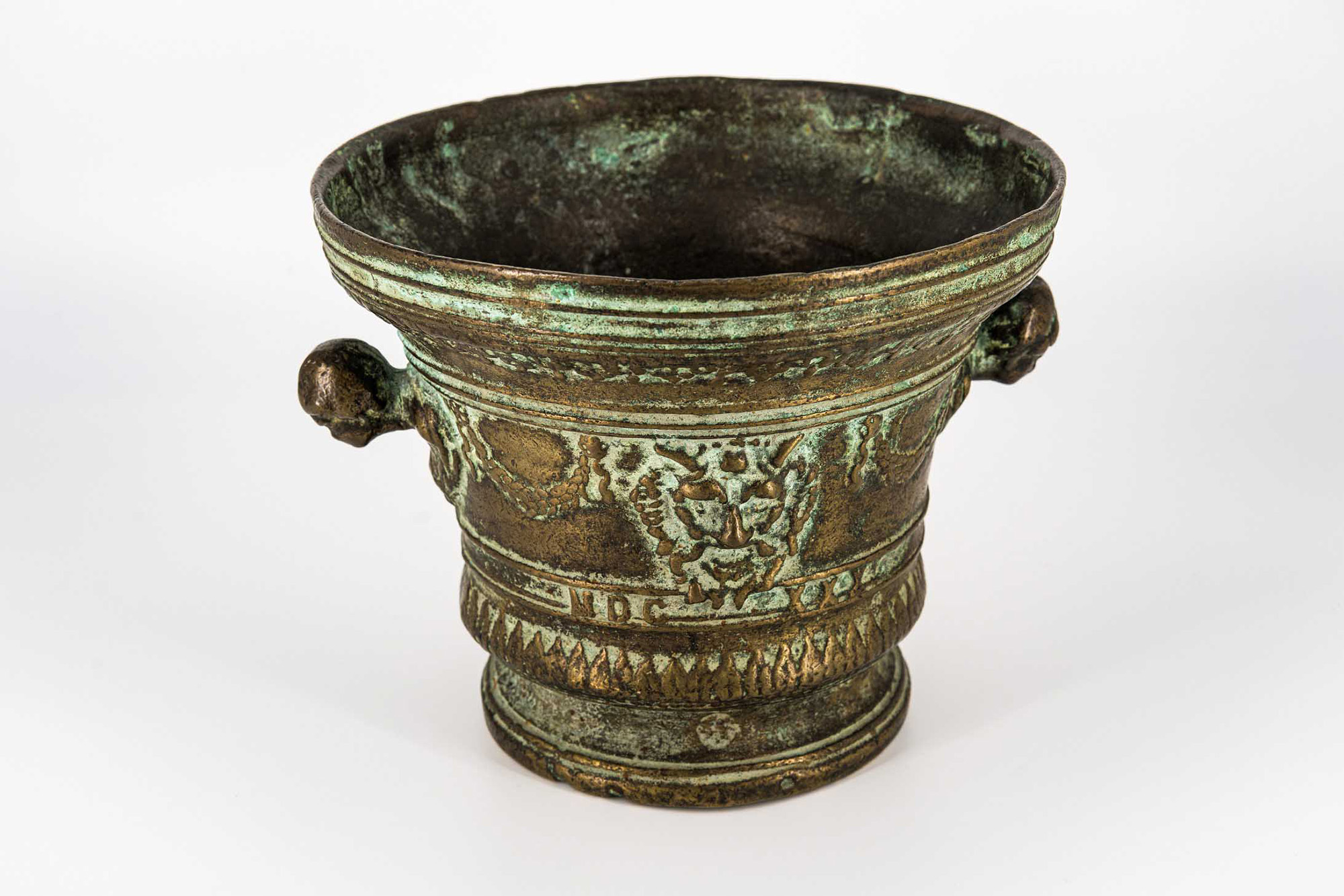 con fascia decorata da mascheroni tra festoni e due prese a forma di teste antropomorfe, datato MDCXXX e siglato G.B.A., copia ottocentesca di un originale del XVII secolo