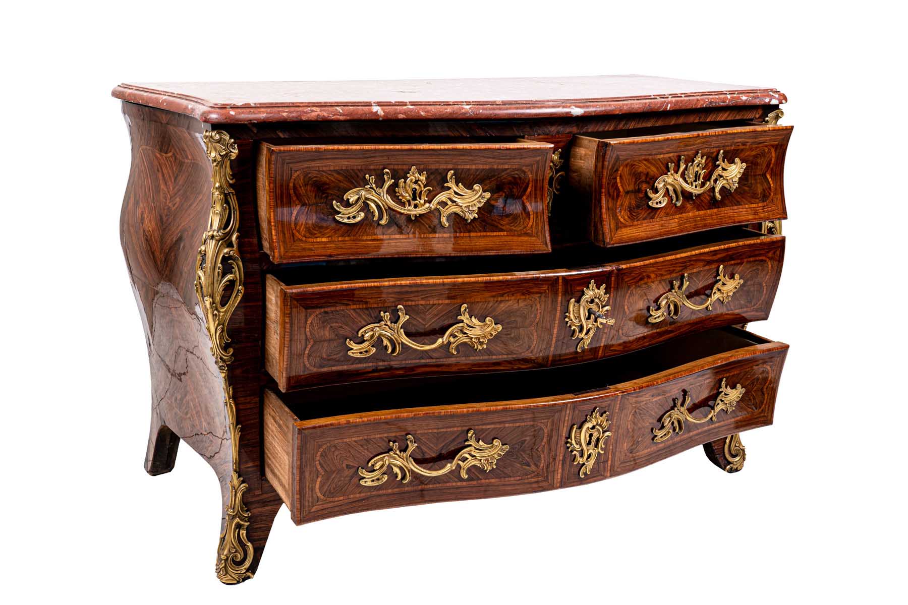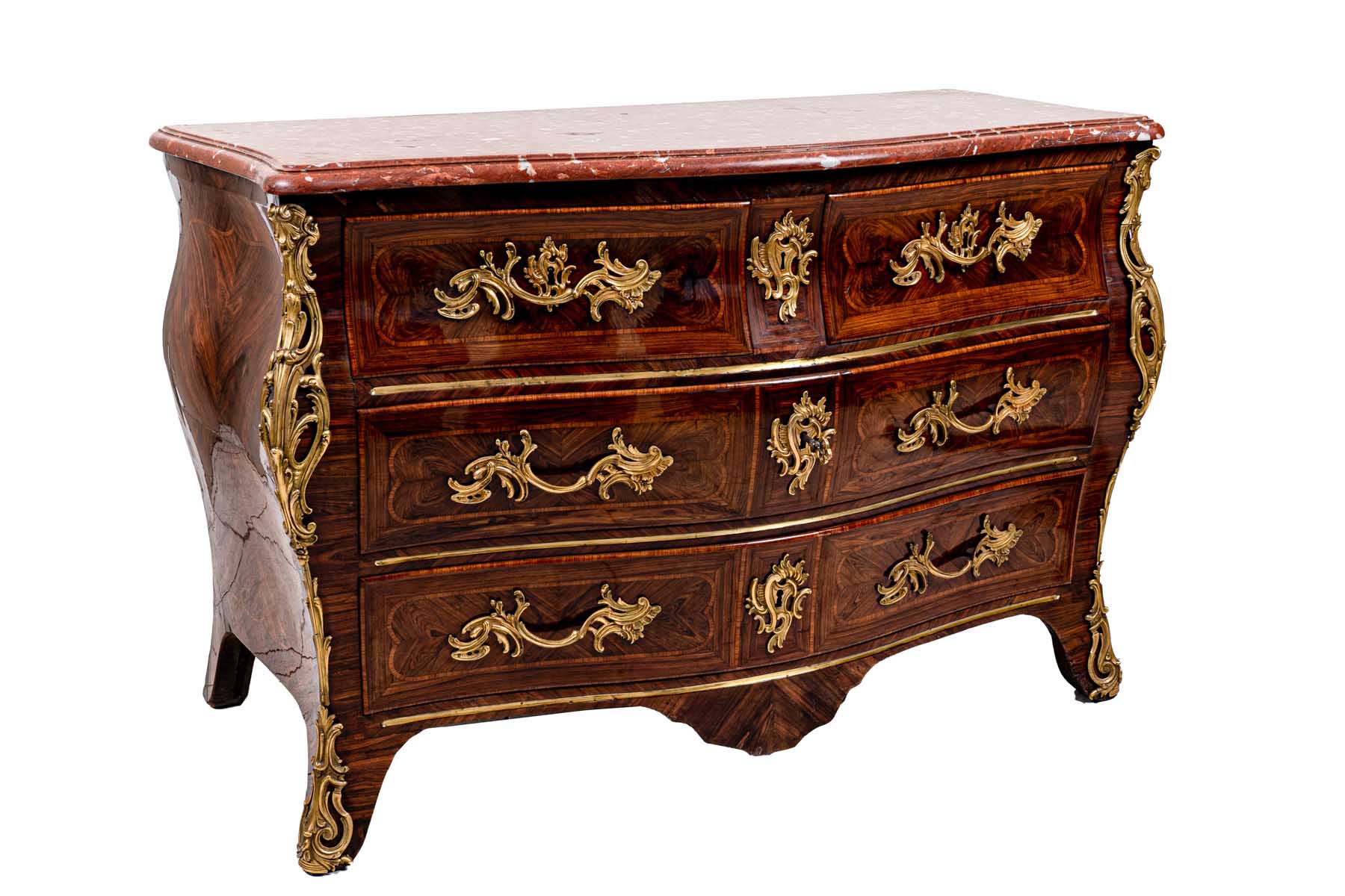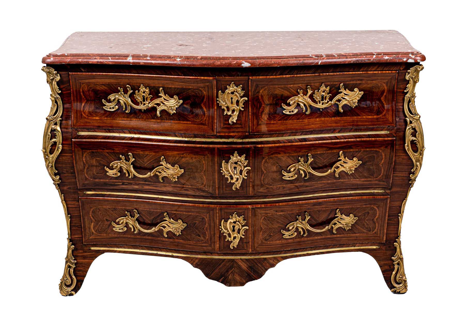 interamente listrato a marqueterie in bois de violette, piano sagomato in breccia di marmo rosso, fronte mosso a tre cassetti, pendaglina sagomata, maniglie, bocchette, profili e scarpette in bronzo dorato