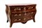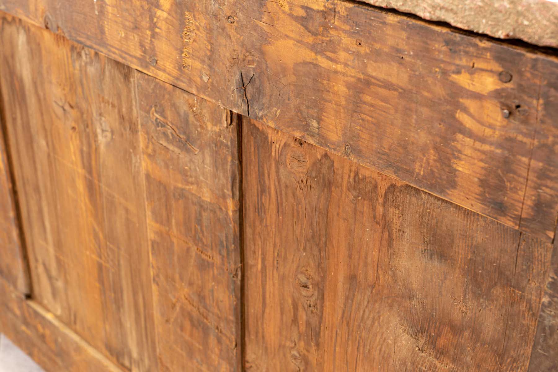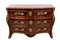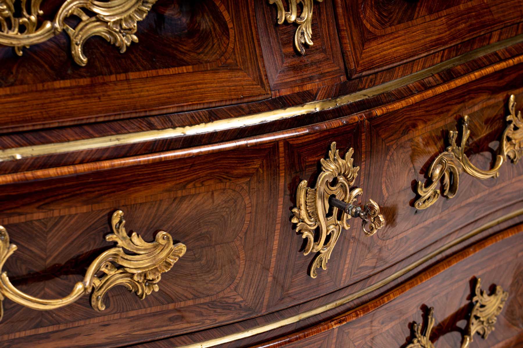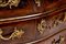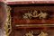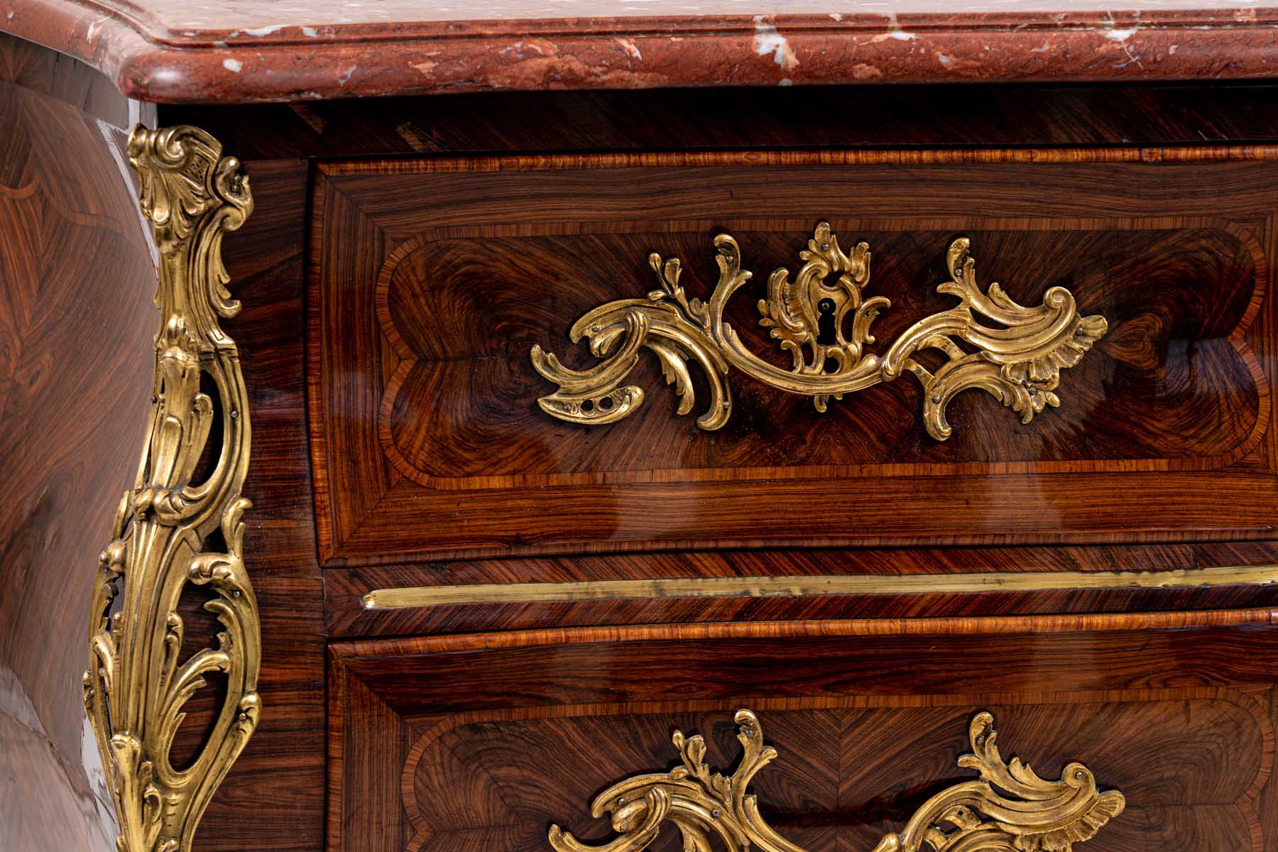interamente listrato a marqueterie in bois de violette, piano sagomato in breccia di marmo rosso, fronte mosso a tre cassetti, pendaglina sagomata, maniglie, bocchette, profili e scarpette in bronzo dorato