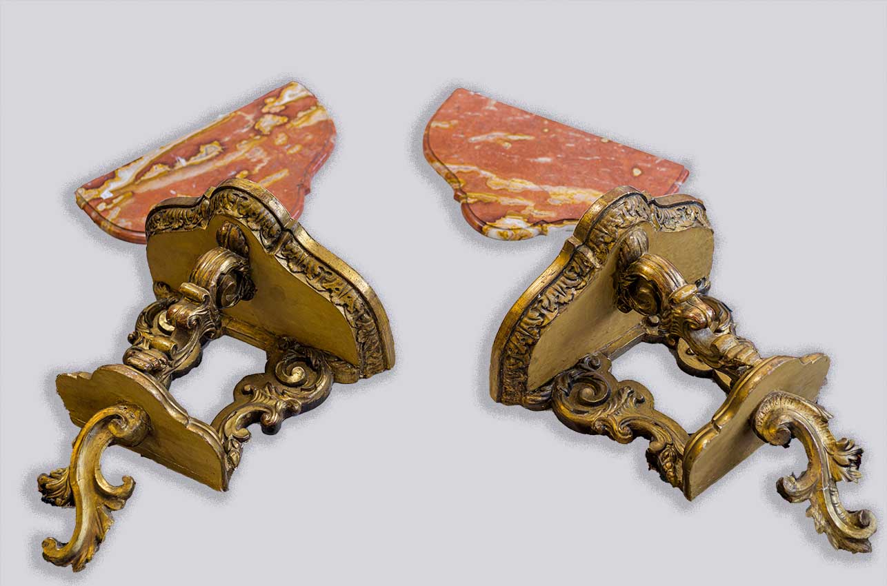 in stile Settecento, in legno intagliato e dorato con piano sagomato in breccia di marmo rosso, sostegni modellati a volute fitomorfe