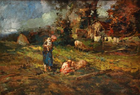 Giuseppe Solenghi (1879 - 1944) olio su cartone telato 'Famiglia di contadini' firmato in basso a destra e datato 1935
