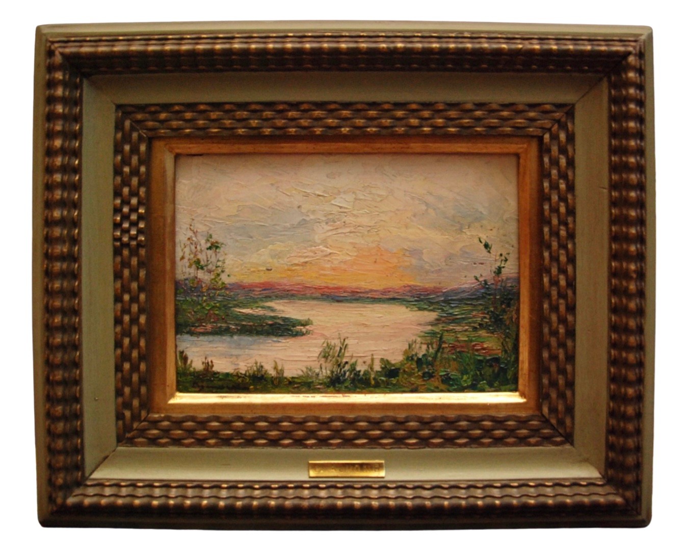 Lidio Ajmone (1884 - 1945) olio su tavoletta raff. paesaggio lacustre firmato in basso a sinistra
