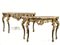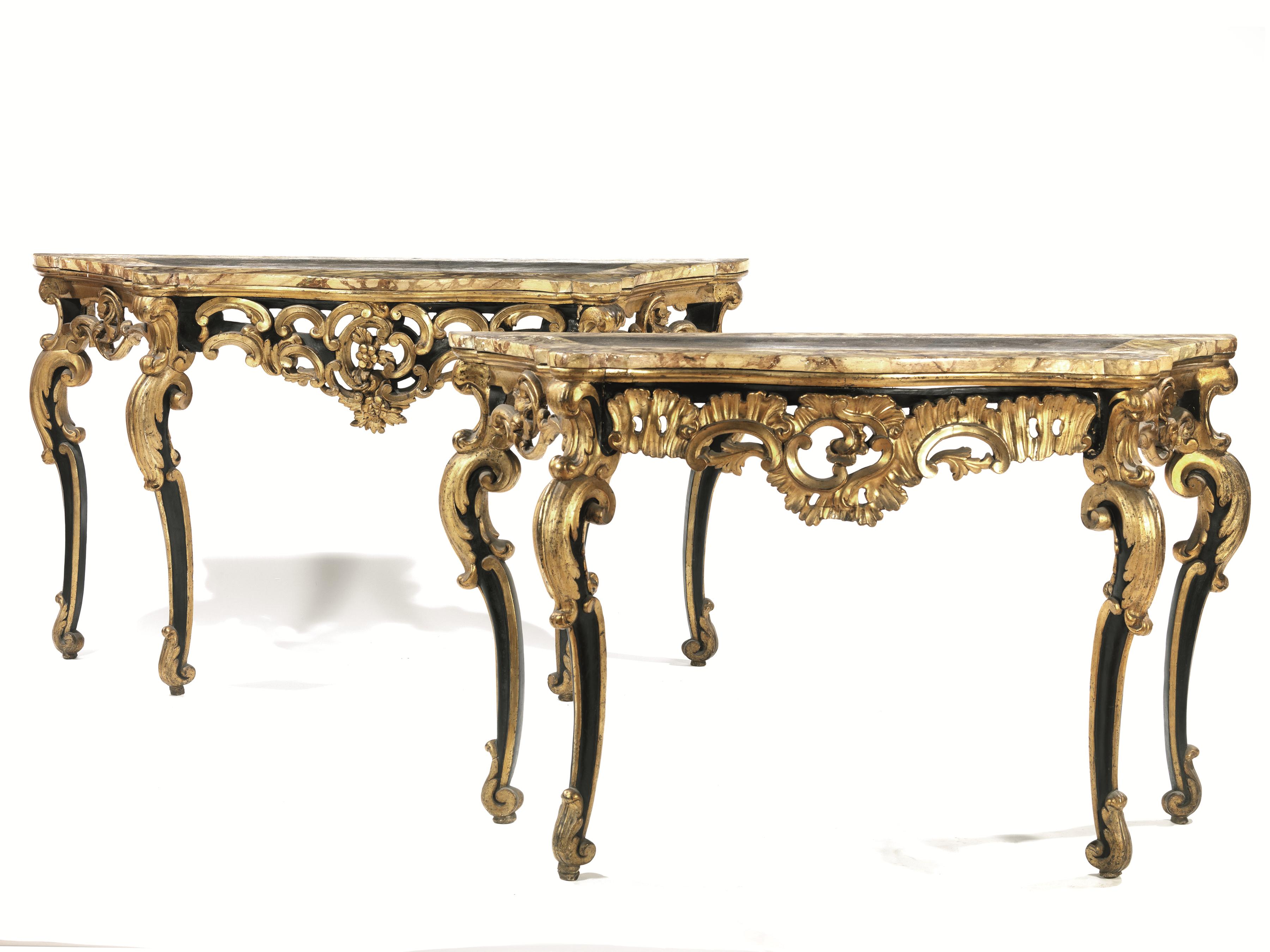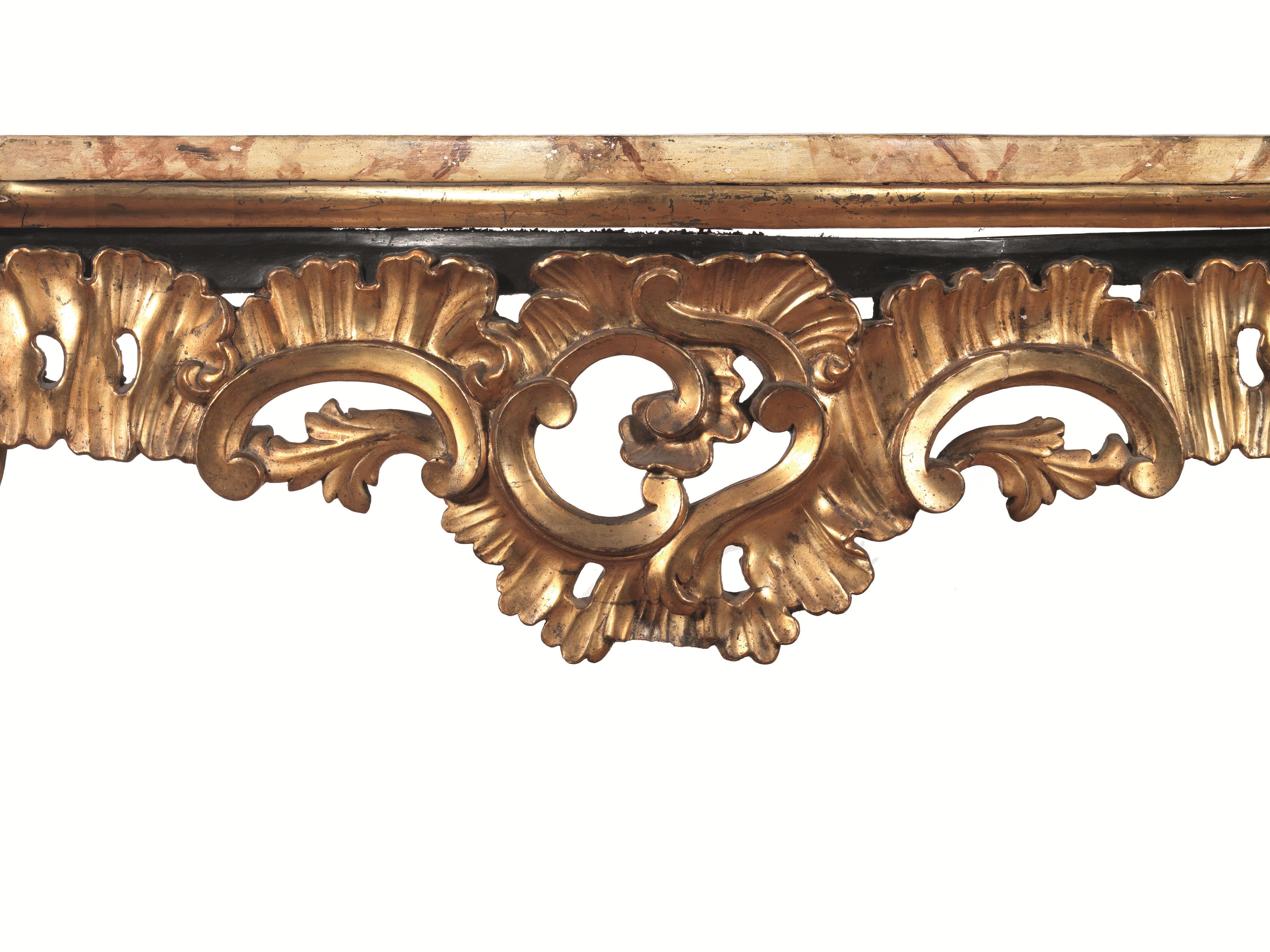 Due consoles, Marche, metà sec. XVIII, in legno intagliato e dorato a mecca, piano sagomato e dipinto con bordo a finto marmo di Siena, interno in finto porfido, pendaglina frontale e laterale a volute con motivi floreali, gambe a volute contrapposte, piedi a ricciolo, simili fra loro, cm 150x48x87 e cm 135x50x87, piccoli danni e mancanze