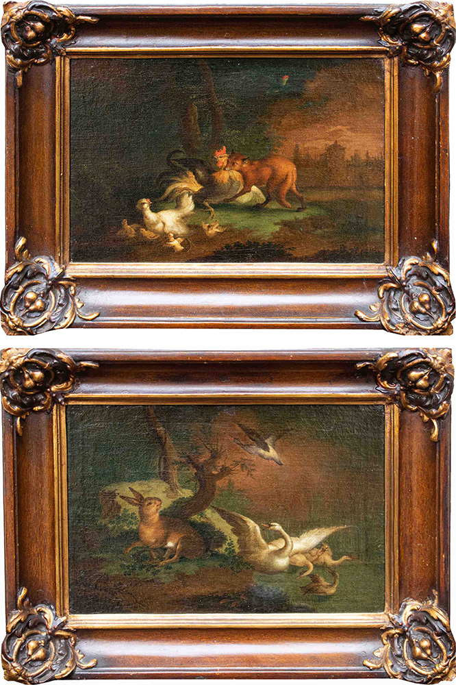 Scuola fiamminga coppia di oli su tela raff. nature morte raff.animali sec. XVII