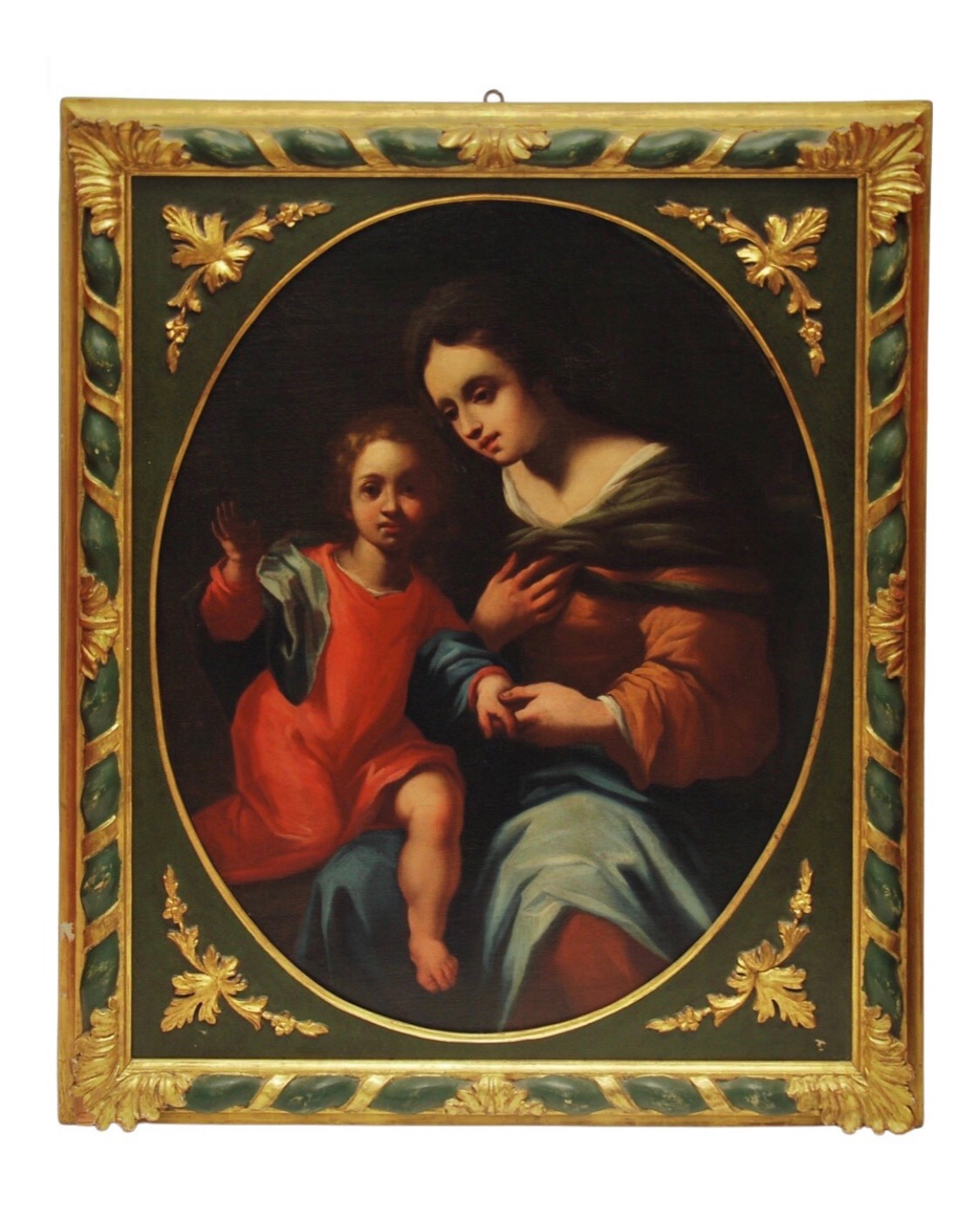 Olio su tela raff. Madonna con bambino in cornice laccata e dorata sec. XVII