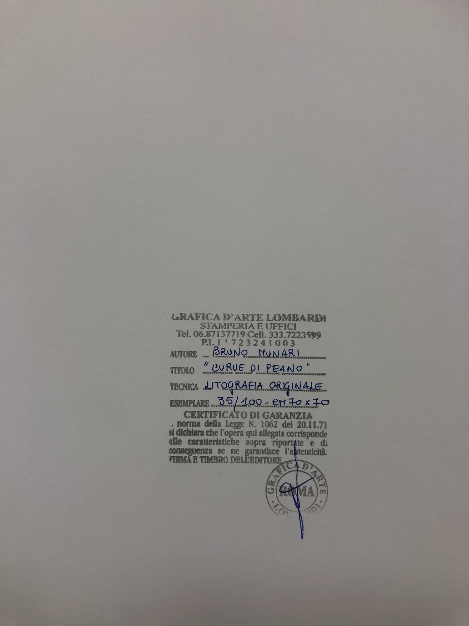 Bruno Munari "Curve di Peano". Lithograph on museum cardboard. Size: cm 70 x 70 - in 27,6 x 27,6. Edition of 100 copies + XXX. Copy n. 35/100. Edition for the Museo de Arte Contemporàneo - Barcelona. Hand signed and numbered lower center: "MUNARI 35 - 100".