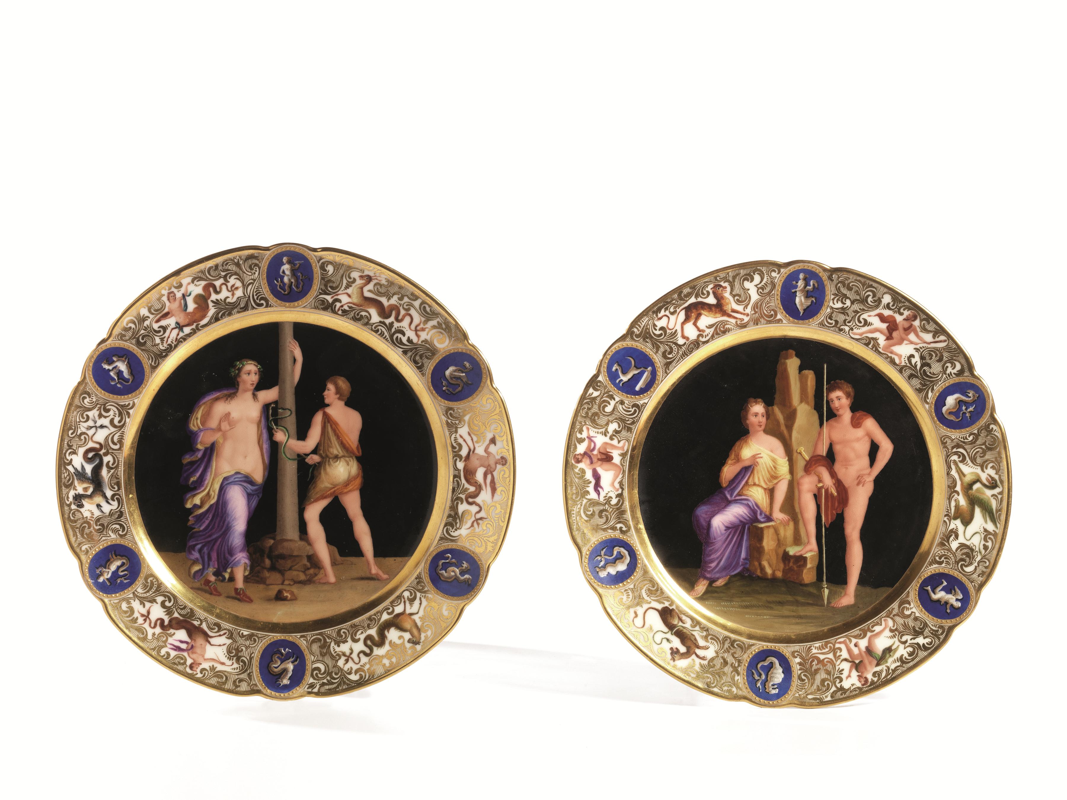 Coppia di piatti, Napoli prima metà sec. XIX, firmati Raffaele Giovine, in porcellana policroma, con scene mitologiche tratte da pitture pompeiane, tesa a volute in oro intercalate da medaglioni ad imitazione dei cammei, bordo smerlato,diam. cm 24. Nel retro recano la scritta "Raffaele Giovine in Napoli, Pittura di Pompei (2)