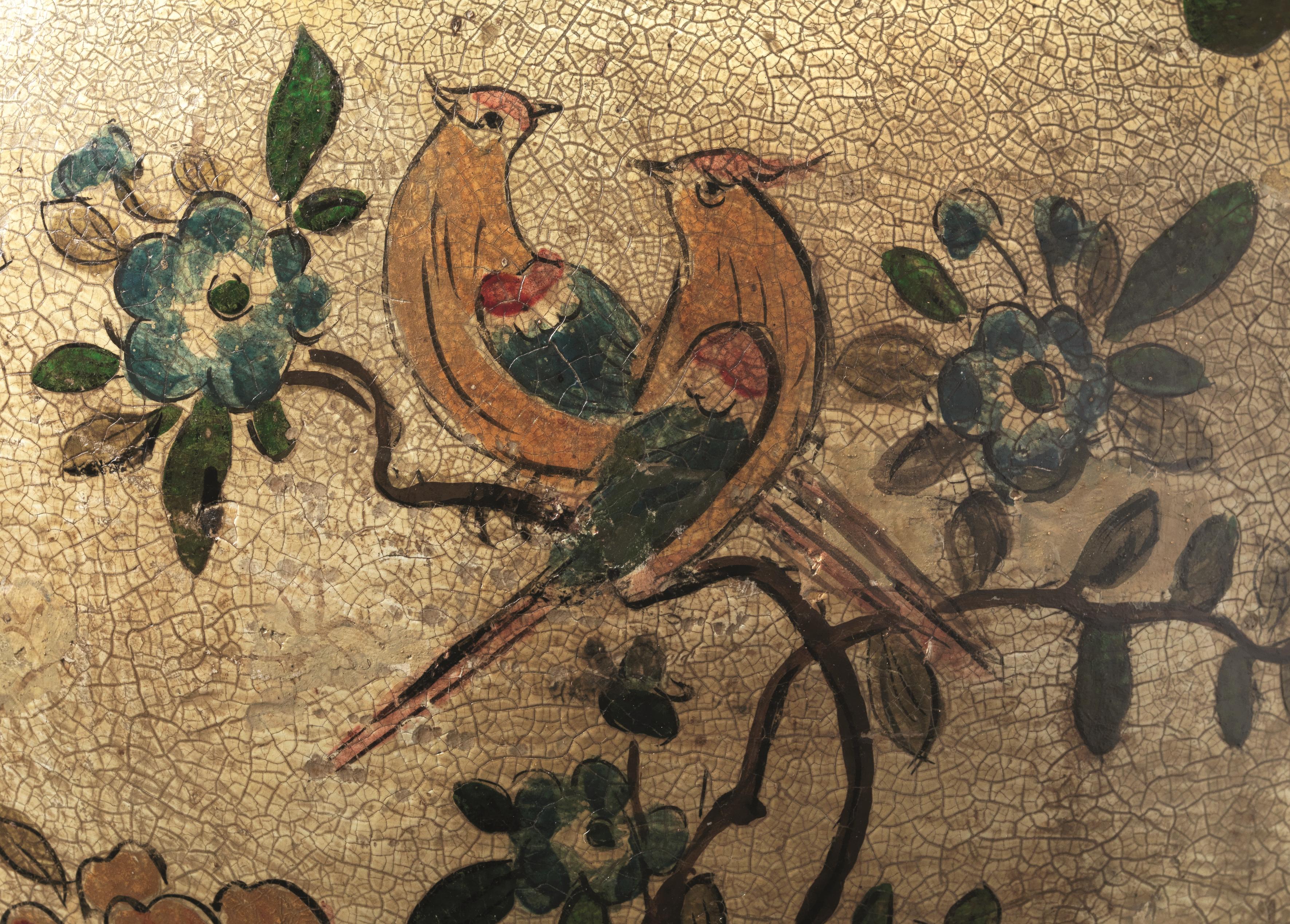 Coppia di potiche, Piemonte, sec. XVIII, in ceramica a fondo verde olio con craquele, decorate a fiori, animali e motivi di gusto orientale, coperchi con presa a trottola, alt. cm 68 completi di basi in legno intagliato e dorato (2)