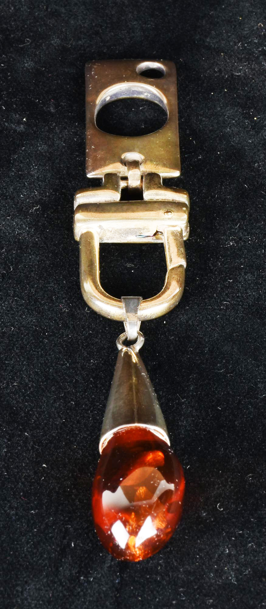 PORTACHIAVI in metallo argentato e pendente con pietra a imitazione ambra...