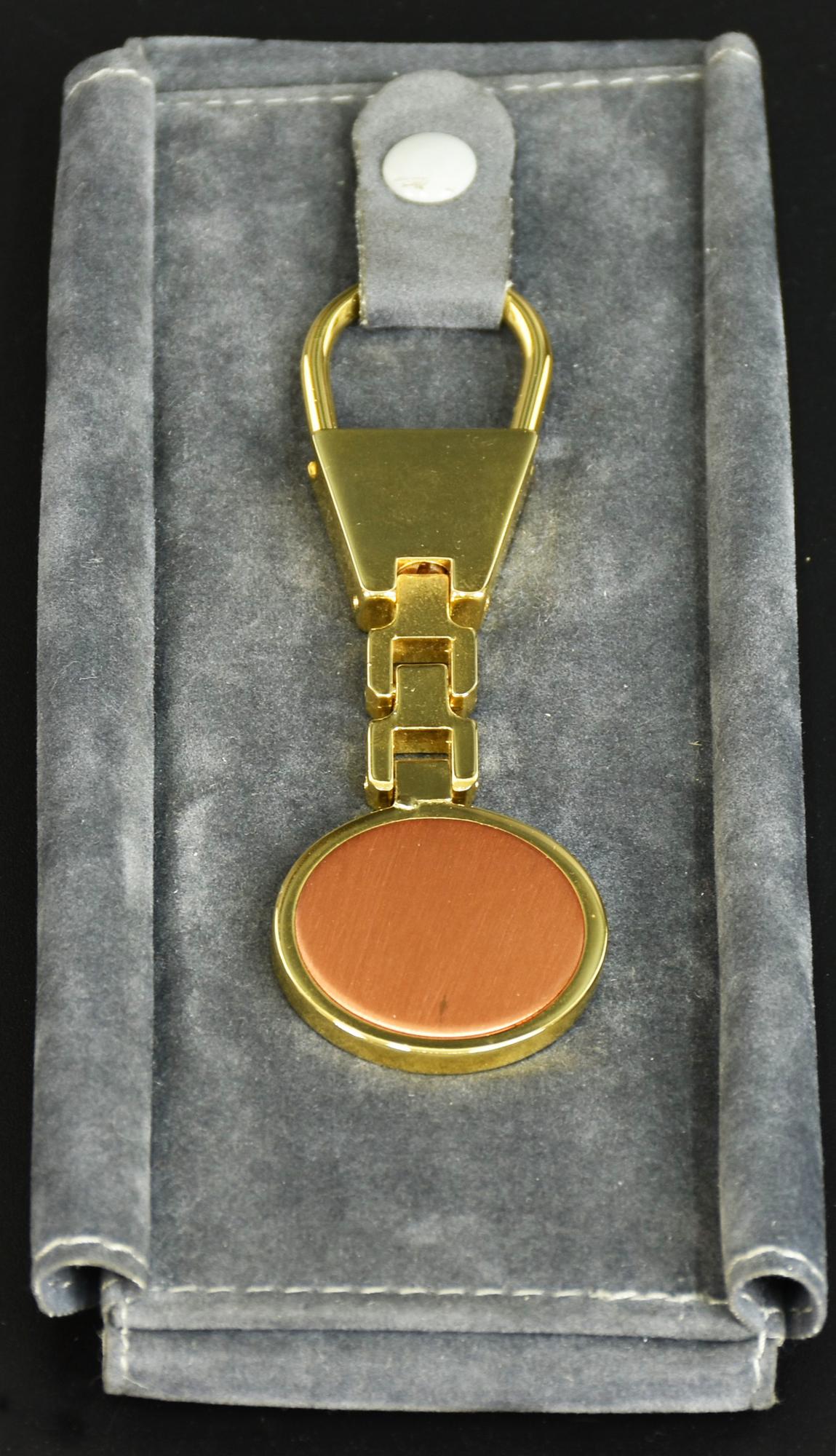 portachiavi in metallo dorato, sistema di chiusura a gancio rotante, entro custodia originale
